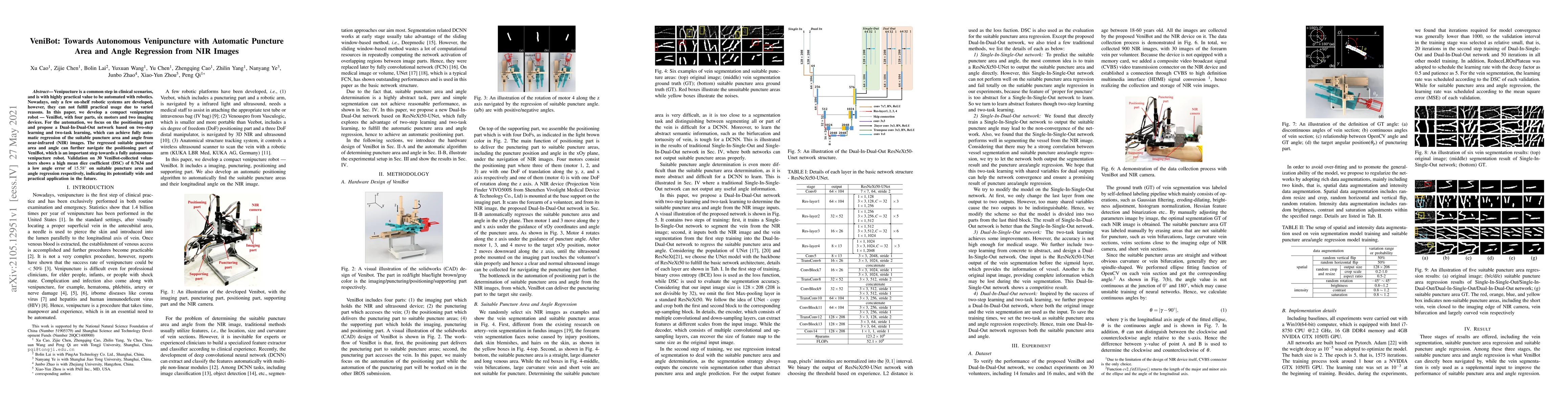 VeniBot is a compact robotic system designed to automate venipuncture, utilizing a Dual-In-Dual-Out network for automatic regression of puncture area and angle from NIR images. Validation results show high accuracy in area detection and angle prediction, indicating potential for practical clinical use.