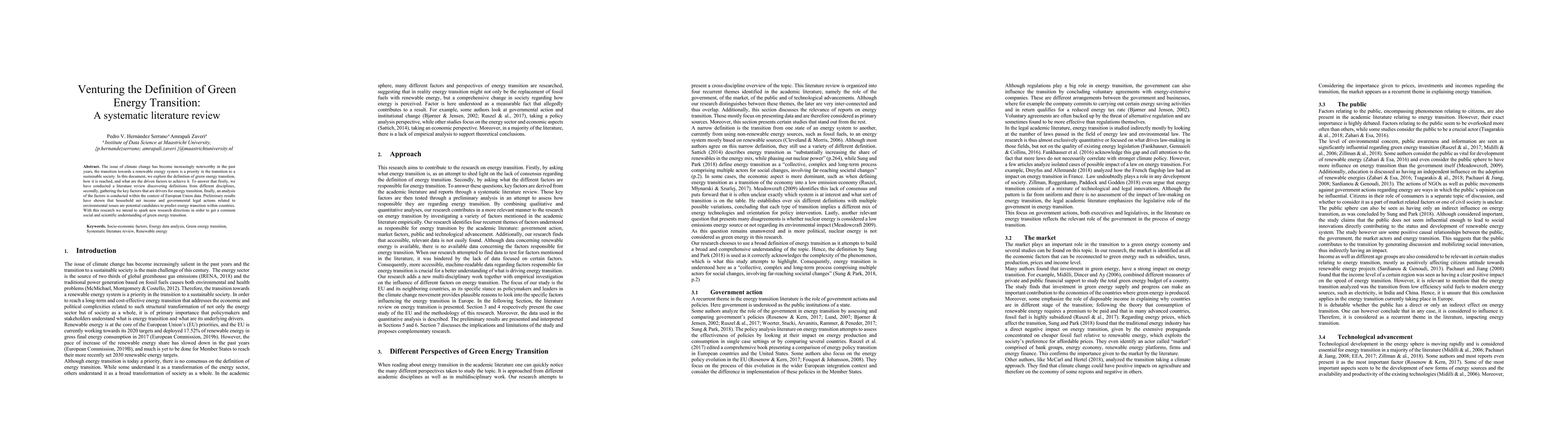 The issue of climate change has become increasingly noteworthy in the past years, the transition towards a renewable energy system is a priority in the transition to a sustainable society. In this document, we explore the definition of green energy transition, how it is reached, and what are the driven factors to achieve it. To answer that firstly, we have conducted a literature review discovering definitions from different disciplines, secondly, gathering the key factors that are drivers for energy transition, finally, an analysis of the factors is conducted within the context of European Union data. Preliminary results have shown that household net income and governmental legal actions related to environmental issues are potential candidates to predict energy transition within countries. With this research, we intend to spark new research directions in order to get a common social and scientific understanding of green energy transition.