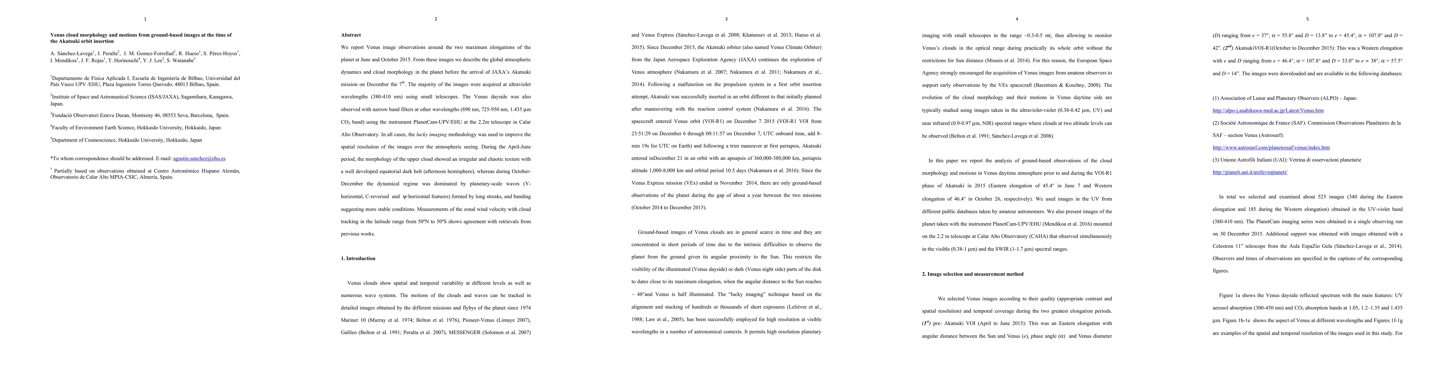 Researchers observed Venus' cloud morphology using ground-based images in 2015, revealing chaotic upper clouds with an equatorial dark belt and stable conditions with planetary-scale waves during the Akatsuki mission's orbit insertion.