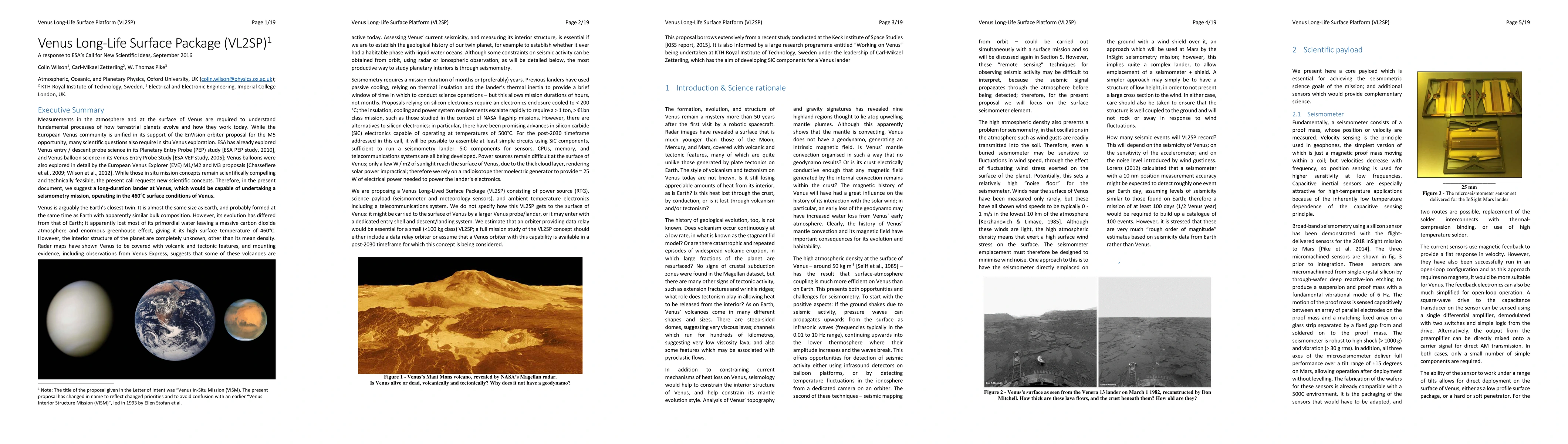 Measurements in the atmosphere and at the surface of Venus are required to understand fundamental processes of how terrestrial planets evolve and how they work today. While the European Venus community is unified in its support of the EnVision orbiter proposal for the M5 opportunity, many scientific questions also require in situ Venus exploration. ESA has already explored Venus entry / descent probe science in its Planetary Entry Probe (PEP) study [ESA PEP study, 2010], and Venus balloon science in its Venus Entry Probe Study [ESA VEP study, 2005]; Venus balloons were also explored in detail by the European Venus Explorer (EVE) M1/M2 and M3 proposals [Chassefiere et al., 2009; Wilson et al., 2012]. While those in situ mission concepts remain scientifically compelling and technically feasible, the present call requests new scientific concepts. Therefore, in the present document, we suggest a long-duration lander at Venus, which would be capable of undertaking a seismometry mission, operating in the 460{\deg}C surface conditions of Venus.