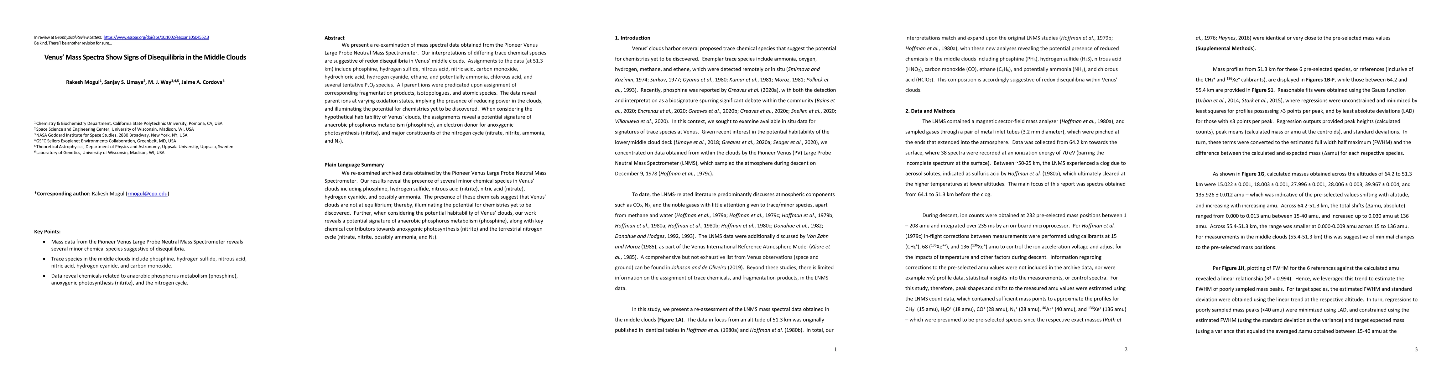 This paper re-examines mass spectral data from Venus' middle clouds, revealing trace chemical species indicative of redox disequilibria, including phosphine and nitric acid, suggesting reducing conditions and potential for undiscovered chemistries. The findings hint at possible anaerobic phosphorus metabolism and components of the nitrogen cycle, raising questions about Venus' clouds' hypothetical habitability.