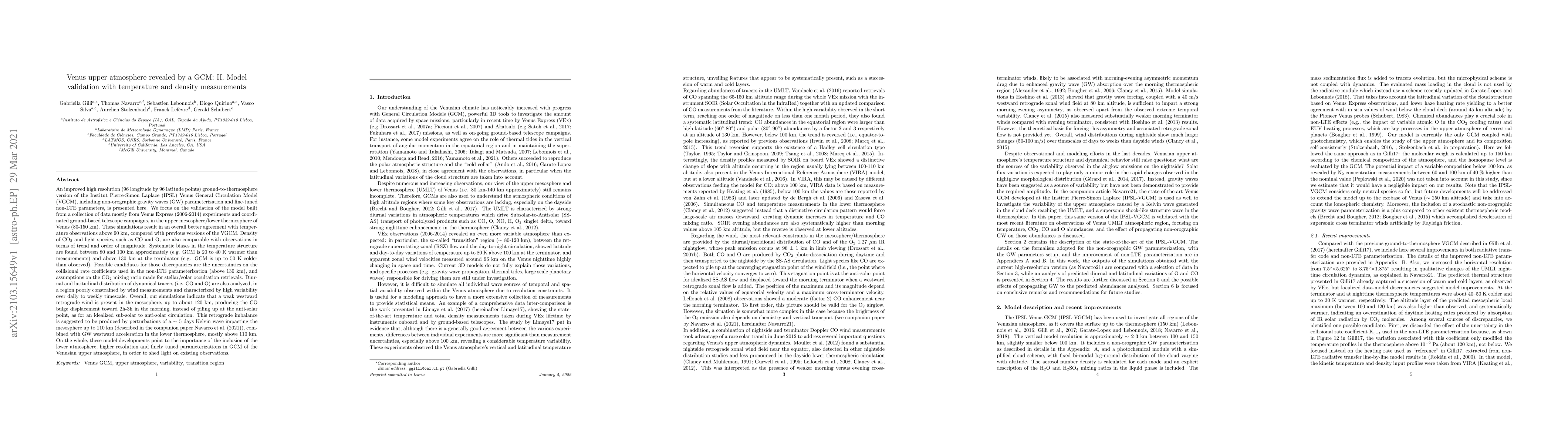 The research paper presents an improved Venus General Circulation Model (VGCM) with enhanced non-orographic gravity wave parameterization and non-LTE finetuning. Validation against Venus Express and ground-based data shows better temperature agreement above 90 km and comparable CO2, CO, and O densities. Systematic biases are noted at 80-100 km and above 130 km. The model reveals a westward retrograde wind up to 120 km, influencing the CO bulge's displacement, likely due to 5-day Kelvin waves and gravity wave westward acceleration.