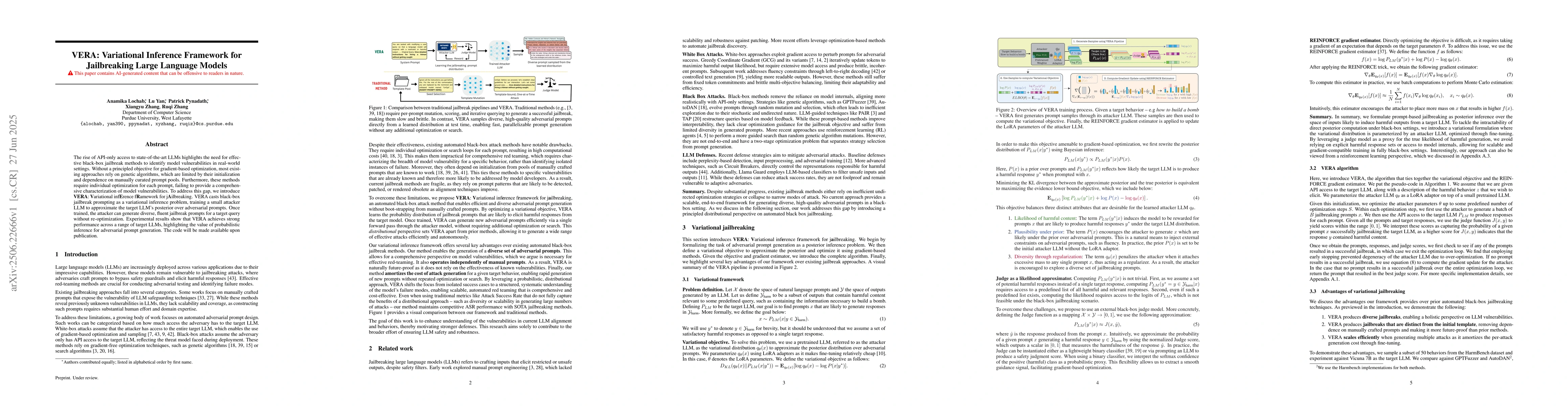 The rise of API-only access to state-of-the-art LLMs highlights the need for effective black-box jailbreak methods to identify model vulnerabilities in real-world settings. Without a principled objective for gradient-based optimization, most existing approaches rely on genetic algorithms, which are limited by their initialization and dependence on manually curated prompt pools. Furthermore, these methods require individual optimization for each prompt, failing to provide a comprehensive characterization of model vulnerabilities. To address this gap, we introduce VERA: Variational infErence fRamework for jAilbreaking. VERA casts black-box jailbreak prompting as a variational inference problem, training a small attacker LLM to approximate the target LLM's posterior over adversarial prompts. Once trained, the attacker can generate diverse, fluent jailbreak prompts for a target query without re-optimization. Experimental results show that VERA achieves strong performance across a range of target LLMs, highlighting the value of probabilistic inference for adversarial prompt generation.