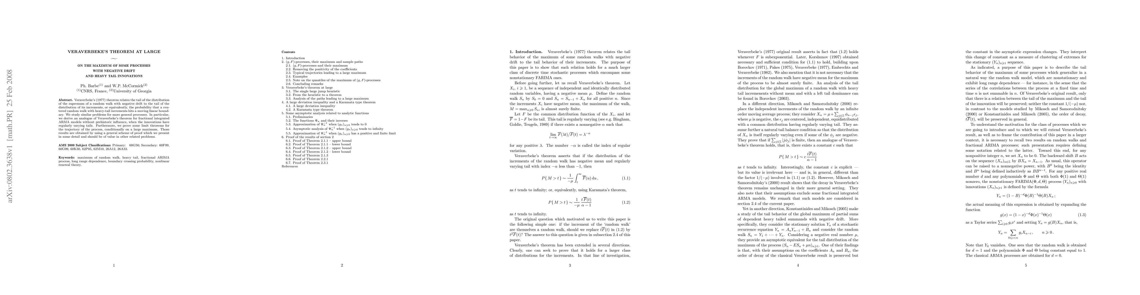 Veraverbeke's (1977) theorem relates the tail of the distribution of the supremum of a random walk with negative drift to the tail of the distribution of its increments, or equivalently, the probability that a centered random walk with heavy-tail increments hits a moving linear boundary. We study similar problems for more general processes. In particular, we derive an analogue of Veraverbeke's theorem for fractional integrated ARMA models without prehistoric influence, when the innovations have regularly varying tails. Furthermore, we prove some limit theorems for the trajectory of the process, conditionally on a large maximum. Those results are obtained by using a general scheme of proof which we present in some detail and should be of value in other related problems.