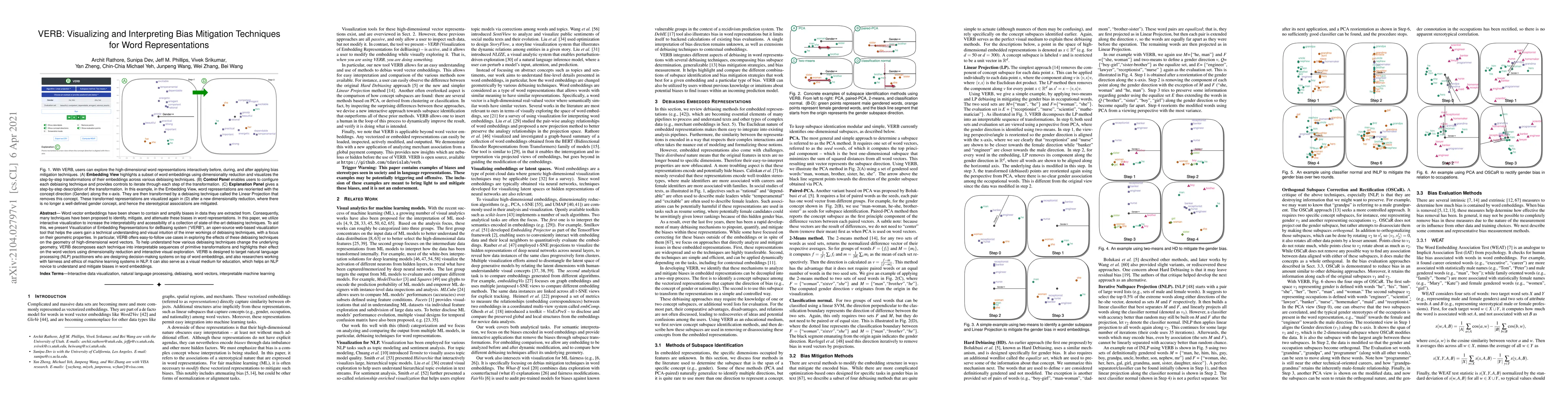 VERB presents a novel, interactive visualization tool that decomposes debiasing techniques into interpretable sequences of primitive transformations, enhancing understanding and accessibility of bias mitigation in word embeddings.