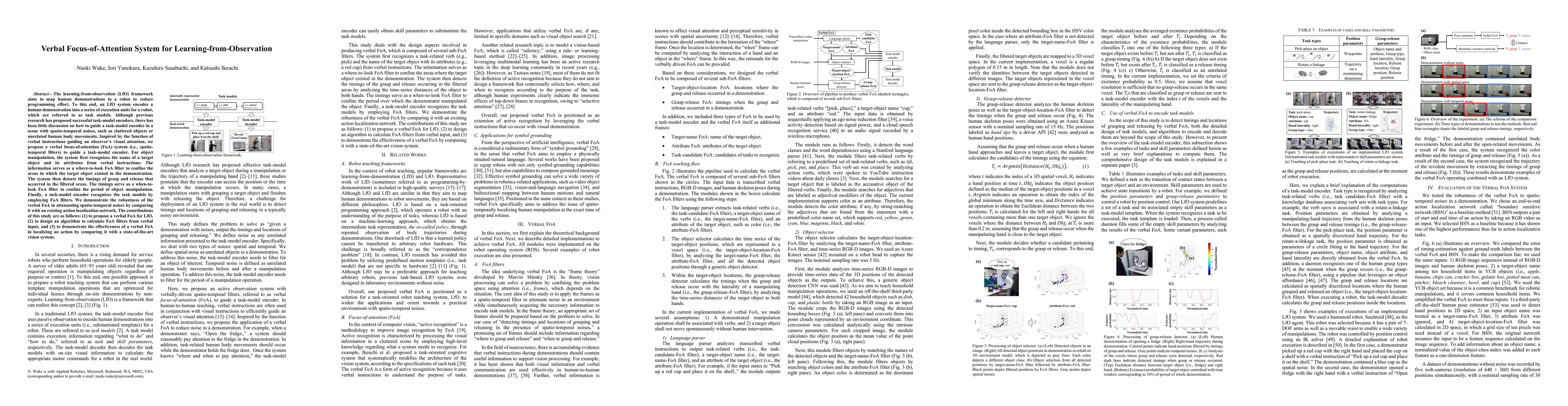 The learning-from-observation (LfO) framework aims to map human demonstrations to a robot to reduce programming effort. To this end, an LfO system encodes a human demonstration into a series of execution units for a robot, which are referred to as task models. Although previous research has proposed successful task-model encoders, there has been little discussion on how to guide a task-model encoder in a scene with spatio-temporal noises, such as cluttered objects or unrelated human body movements. Inspired by the function of verbal instructions guiding an observer's visual attention, we propose a verbal focus-of-attention (FoA) system (i.e., spatio-temporal filters) to guide a task-model encoder. For object manipulation, the system first recognizes the name of a target object and its attributes from verbal instructions. The information serves as a where-to-look FoA filter to confine the areas in which the target object existed in the demonstration. The system then detects the timings of grasp and release that occurred in the filtered areas. The timings serve as a when-to-look FoA filter to confine the period of object manipulation. Finally, a task-model encoder recognizes the task models by employing FoA filters. We demonstrate the robustness of the verbal FoA in attenuating spatio-temporal noises by comparing it with an existing action localization network. The contributions of this study are as follows: (1) to propose a verbal FoA for LfO, (2) to design an algorithm to calculate FoA filters from verbal input, and (3) to demonstrate the effectiveness of a verbal FoA in localizing an action by comparing it with a state-of-the-art vision system.