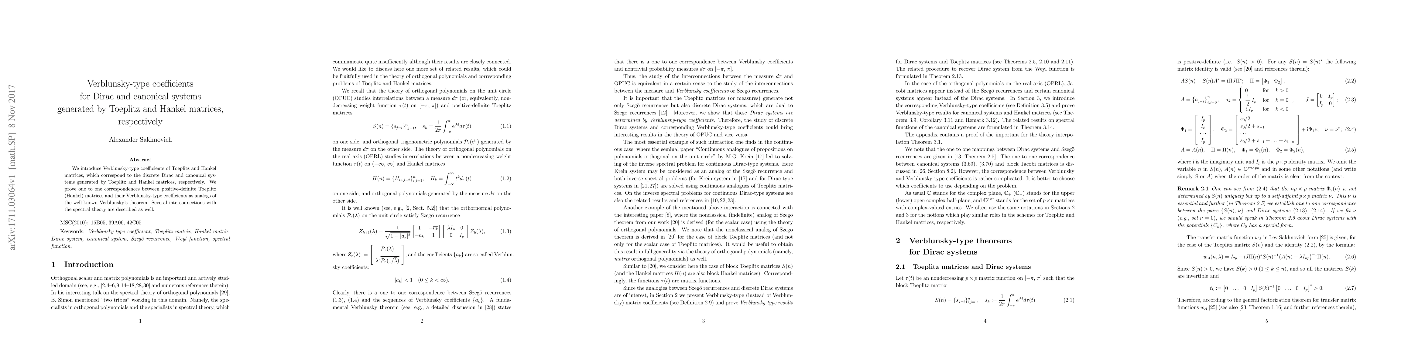 This paper introduces Verblunsky-type coefficients for Toeplitz and Hankel matrices, linking them to discrete Dirac and canonical systems. It establishes a one-to-one correspondence between positive-definite Toeplitz/Hankel matrices and their respective Verblunsky-type coefficients, analogous to Verblunsky's theorem, and explores connections with spectral theory.