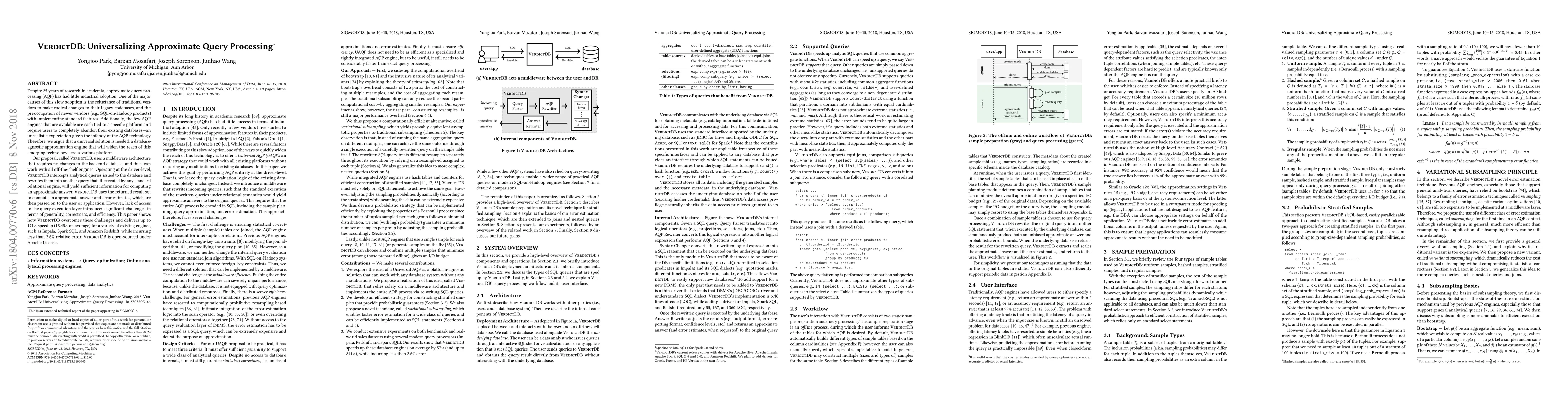 VerdictDB proposes a universal, database-agnostic middleware for approximate query processing that requires no changes to the backend database, enabling significant speedups with minimal error. It intercepts analytical queries and rewrites them for execution on any standard relational engine, achieving up to 171$\times$ speedup on average.