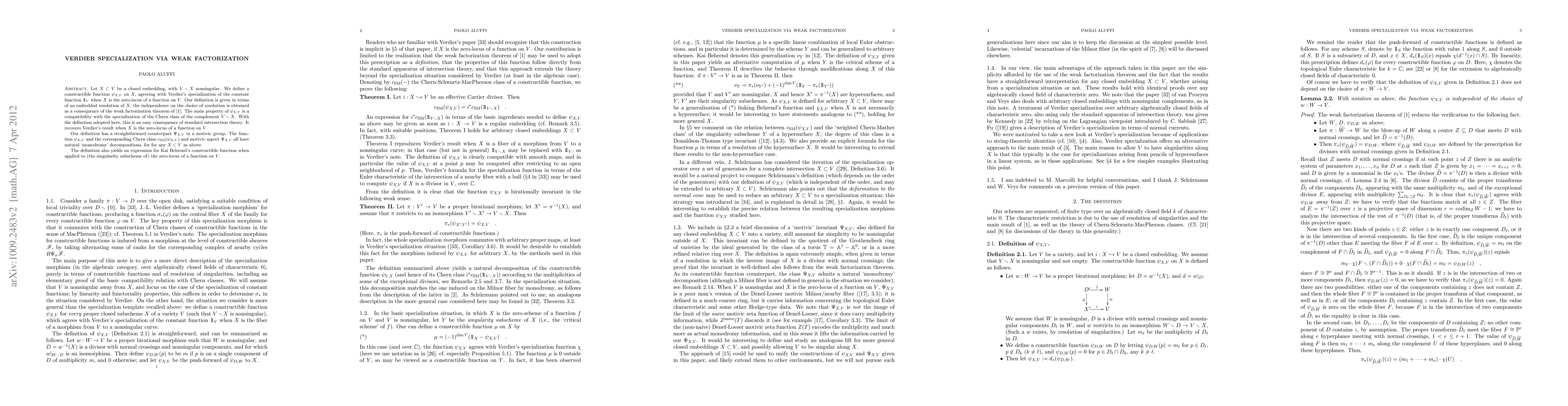 Researchers introduce a new specialization function for constructible functions on closed embeddings in algebraic geometry, recovering Verdier's result and providing a natural counterpart in motivic groups with key implications for monodromy decompositions and related constructs.