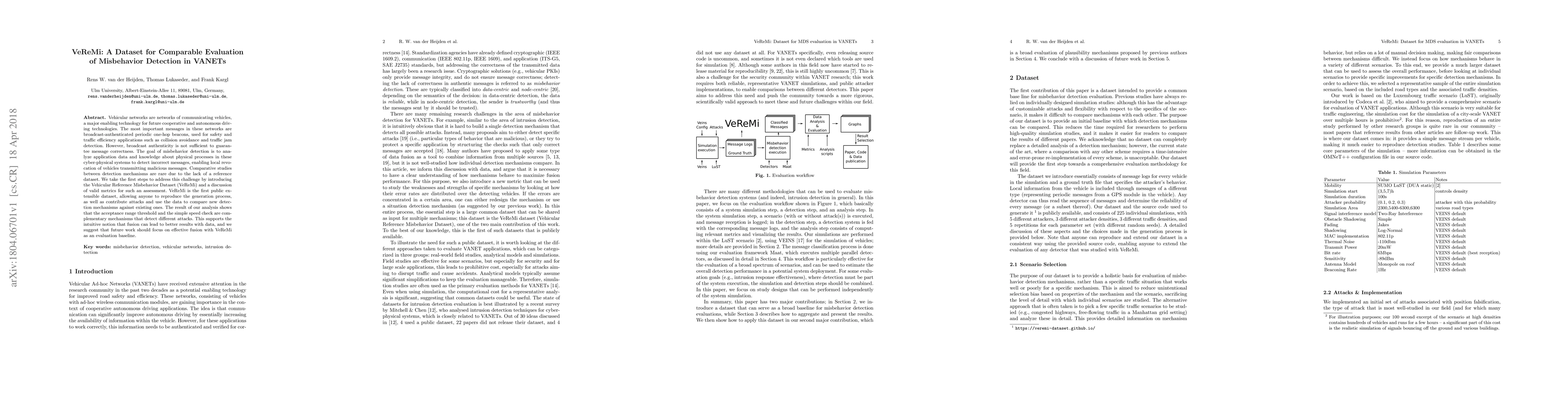 VeReMi introduces a public dataset for evaluating misbehavior detection in vehicular networks, addressing the lack of a reference dataset for comparative studies. The dataset supports the development and comparison of new detection mechanisms, highlighting the complementary nature of acceptance range thresholds and speed checks in detecting different attacks.