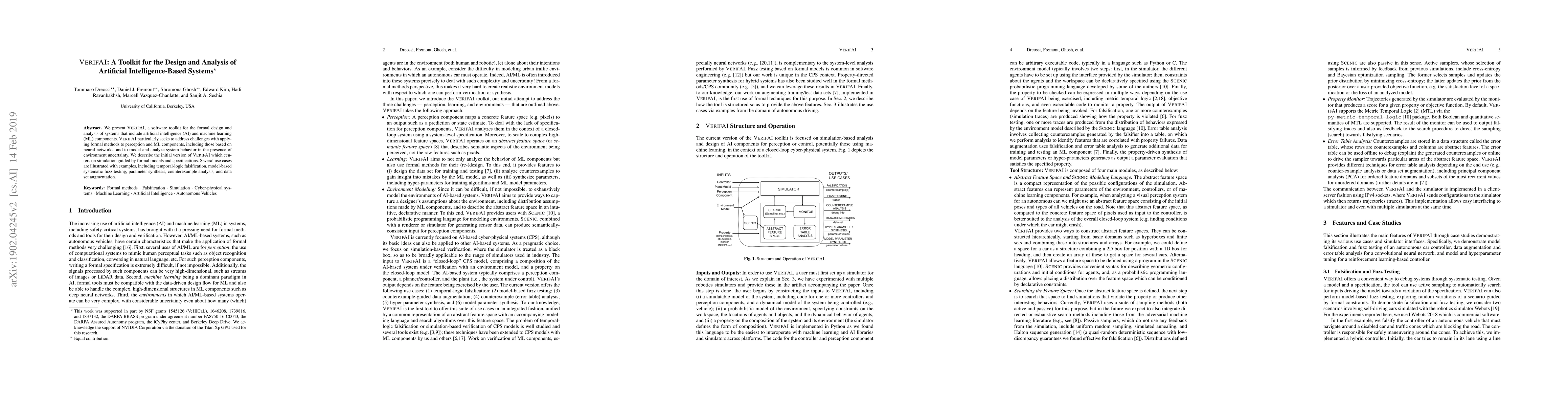 VERIFAI is a software toolkit for the formal design and analysis of AI and ML systems, focusing on neural networks and uncertainty. It employs simulation guided by formal models and includes features like temporal-logic falsification and systematic fuzz testing.