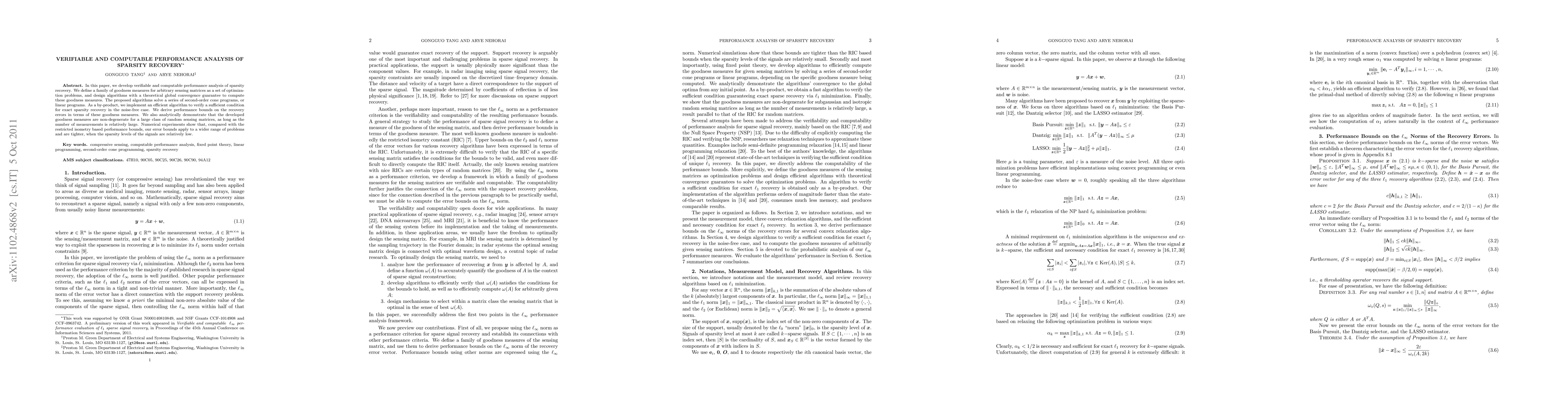 This paper develops algorithms for computing and verifying performance measures for sparsity recovery, offering theoretical global convergence guarantees. The proposed methods solve second-order or linear programs and provide tighter error bounds compared to the restricted isometry based approach, especially for low sparsity levels.