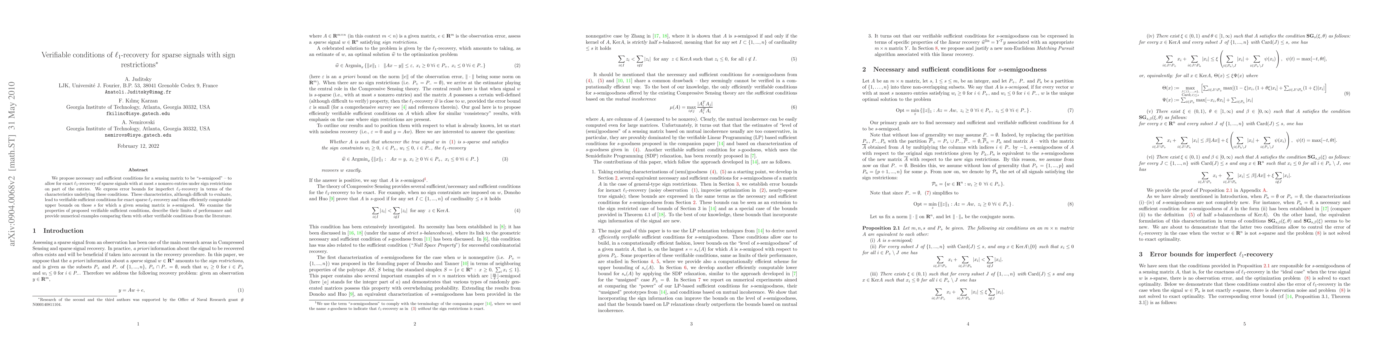 We propose necessary and sufficient conditions for a sensing matrix to be "s-semigood" -- to allow for exact $\ell_1$-recovery of sparse signals with at most $s$ nonzero entries under sign restrictions on part of the entries. We express the error bounds for imperfect $\ell_1$-recovery in terms of the characteristics underlying these conditions. Furthermore, we demonstrate that these characteristics, although difficult to evaluate, lead to verifiable sufficient conditions for exact sparse $\ell_1$-recovery and to efficiently computable upper bounds on those $s$ for which a given sensing matrix is $s$-semigood. We concentrate on the properties of proposed verifiable sufficient conditions of $s$-semigoodness and describe their limits of performance.