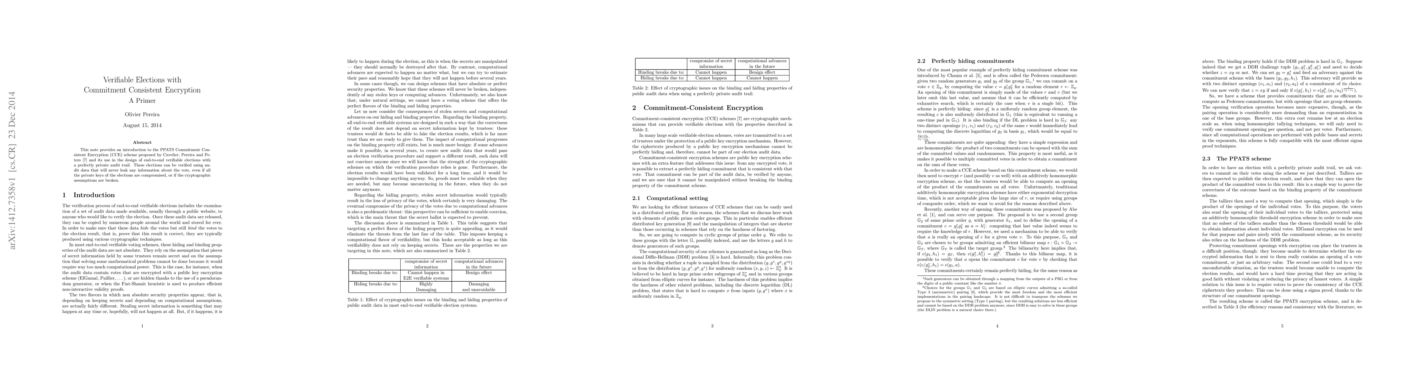 This note provides an introduction to the PPATS Commitment Consistent Encryption (CCE) scheme proposed by Cuvelier, Pereira and Peters and its use in the design of end-to-end verifiable elections with a perfectly private audit trail. These elections can be verified using audit data that will never leak any information about the vote, even if all the private keys of the elections are compromised, or if the cryptographic assumptions are broken.