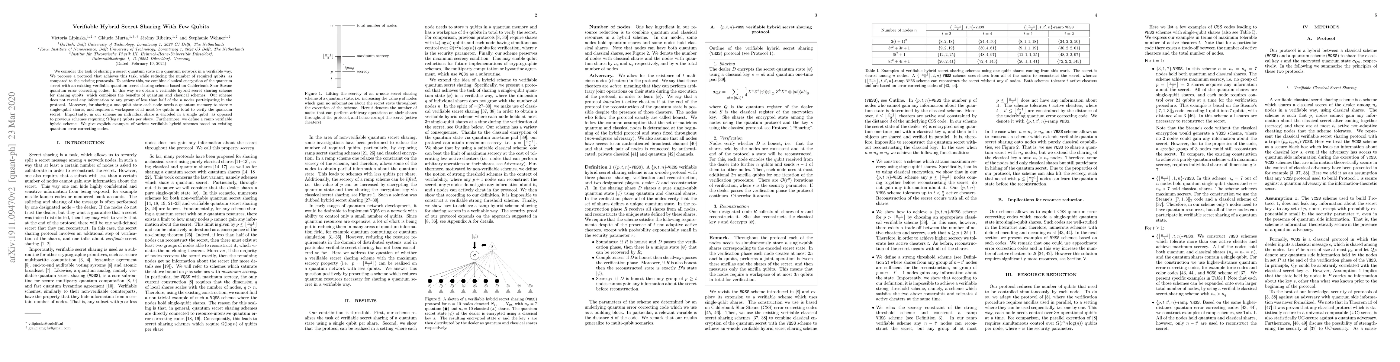 We consider the task of sharing a secret quantum state in a quantum network in a verifiable way. We propose a protocol that achieves this task, while reducing the number of required qubits, as compared to the existing protocols. To achieve this, we combine classical encryption of the quantum secret with an existing verifiable quantum secret sharing scheme based on Calderbank-Shor-Steane quantum error correcting codes. In this way we obtain a verifiable hybrid secret sharing scheme for sharing qubits, which combines the benefits of quantum and classical schemes. Our scheme does not reveal any information to any group of less than half of the $n$ nodes participating in the protocol. Moreover, for sharing a one-qubit state each node needs a quantum memory to store $n$ single-qubit shares, and requires a workspace of at most $3n$ qubits in total to verify the quantum secret. Importantly, in our scheme an individual share is encoded in a single qubit, as opposed to previous schemes requiring $\Omega(\log n)$ qubits per share. Furthermore, we define a ramp verifiable hybrid scheme. We give explicit examples of various verifiable hybrid schemes based on existing quantum error correcting codes.
