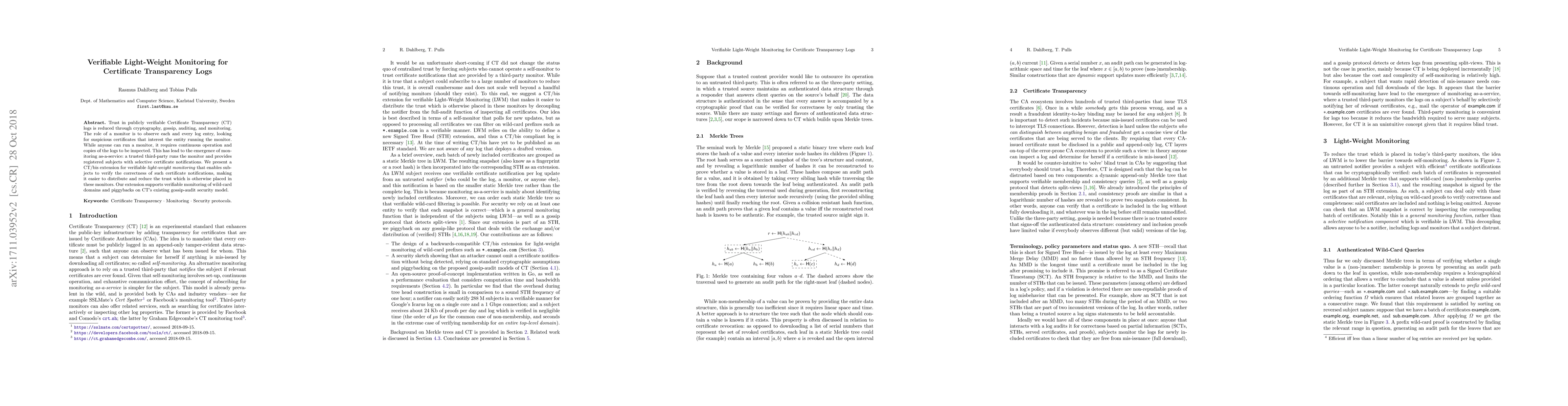This paper proposes a Certificate Transparency (CT) log extension for verifiable light-weight monitoring, enabling users to confirm the accuracy of notifications from monitoring services. It reduces reliance on potentially untrusted monitoring entities by integrating with CT's existing gossip-audit security model.