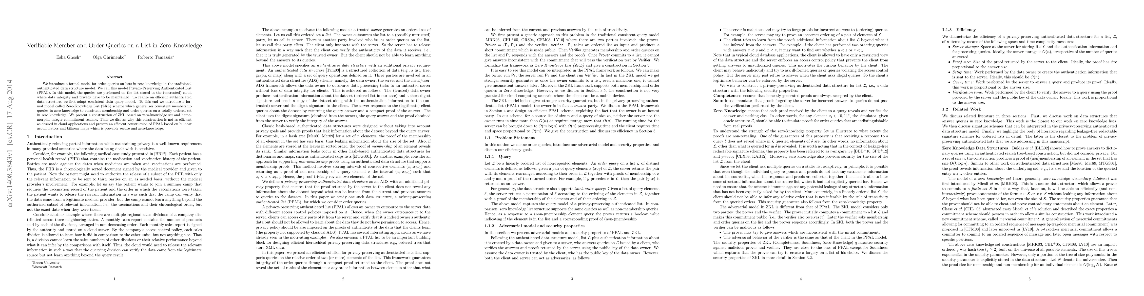 This paper introduces a Privacy-Preserving Authenticated List (PPAL) model for zero-knowledge queries on lists stored in an untrusted cloud, ensuring data integrity and privacy. It presents an efficient construction of PPAL using bilinear accumulators and maps, which is more suitable for cloud applications compared to an initial ZKL scheme based on zero-knowledge sets and homomorphic commitments.
