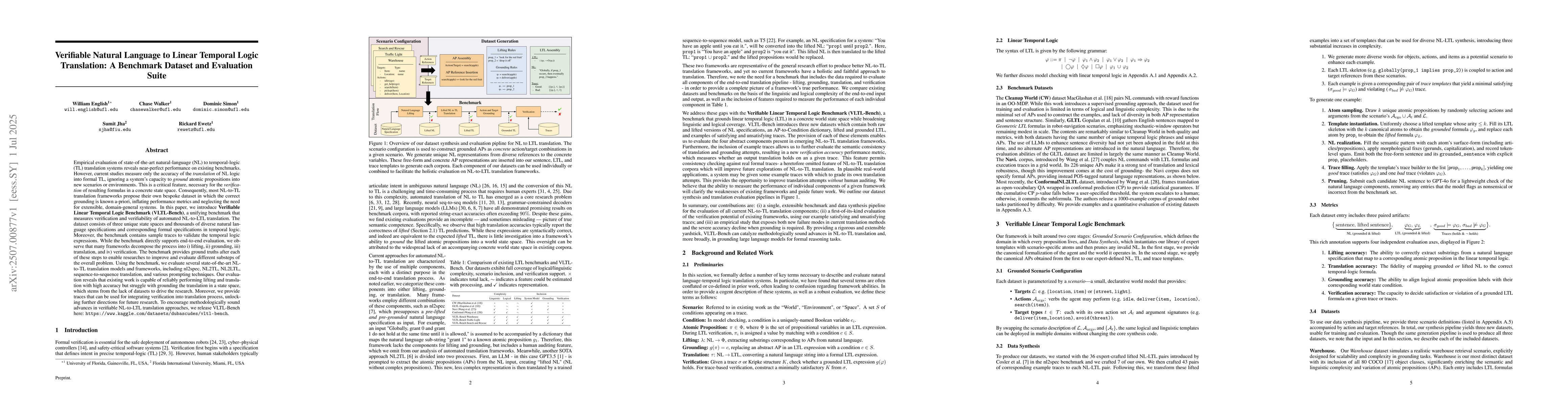 Empirical evaluation of state-of-the-art natural-language (NL) to temporal-logic (TL) translation systems reveals near-perfect performance on existing benchmarks. However, current studies measure only the accuracy of the translation of NL logic into formal TL, ignoring a system's capacity to ground atomic propositions into new scenarios or environments. This is a critical feature, necessary for the verification of resulting formulas in a concrete state space. Consequently, most NL-to-TL translation frameworks propose their own bespoke dataset in which the correct grounding is known a-priori, inflating performance metrics and neglecting the need for extensible, domain-general systems. In this paper, we introduce the Verifiable Linear Temporal Logic Benchmark ( VLTL-Bench), a unifying benchmark that measures verification and verifiability of automated NL-to-LTL translation. The dataset consists of three unique state spaces and thousands of diverse natural language specifications and corresponding formal specifications in temporal logic. Moreover, the benchmark contains sample traces to validate the temporal logic expressions. While the benchmark directly supports end-to-end evaluation, we observe that many frameworks decompose the process into i) lifting, ii) grounding, iii) translation, and iv) verification. The benchmark provides ground truths after each of these steps to enable researches to improve and evaluate different substeps of the overall problem. To encourage methodologically sound advances in verifiable NL-to-LTL translation approaches, we release VLTL-Bench here: https://www.kaggle.com/datasets/dubascudes/vltl bench.