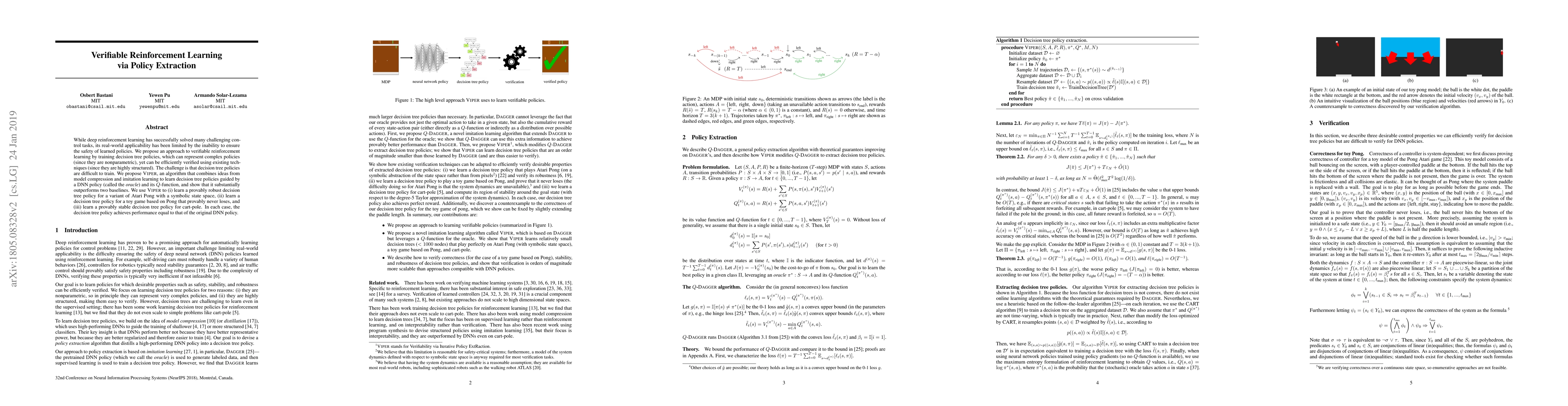 This paper introduces VIPER, a novel reinforcement learning algorithm that trains verifiable decision tree policies using ideas from model compression and imitation learning, guided by a DNN policy and its Q-function. VIPER demonstrates superior performance compared to baselines and successfully applies to games like Atari Pong, a toy Pong variant, and cart-pole, achieving policy safety and stability without compromising performance.