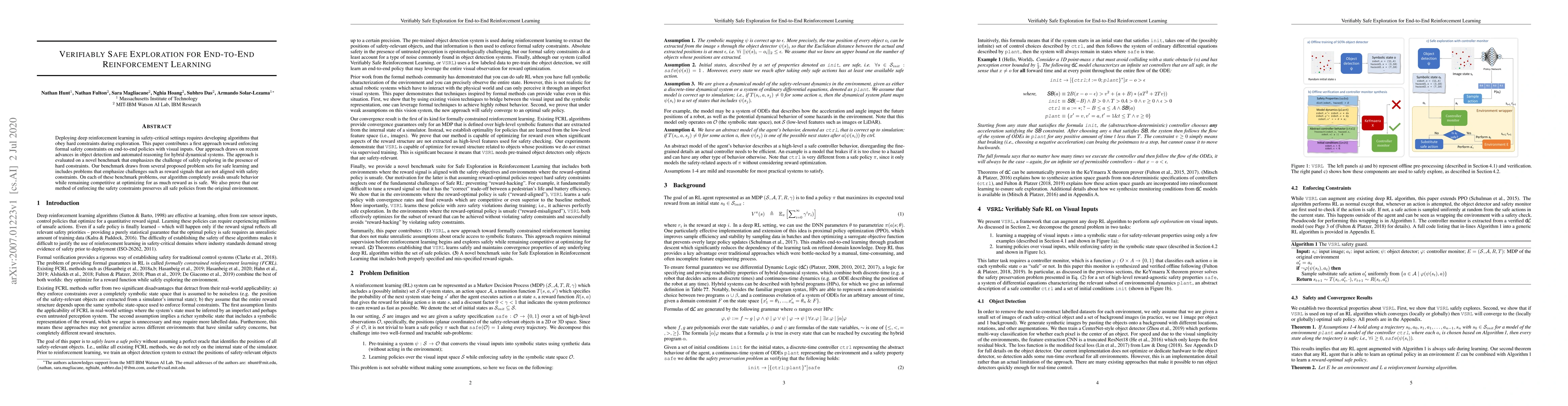 Deploying deep reinforcement learning in safety-critical settings requires developing algorithms that obey hard constraints during exploration. This paper contributes a first approach toward enforcing formal safety constraints on end-to-end policies with visual inputs. Our approach draws on recent advances in object detection and automated reasoning for hybrid dynamical systems. The approach is evaluated on a novel benchmark that emphasizes the challenge of safely exploring in the presence of hard constraints. Our benchmark draws from several proposed problem sets for safe learning and includes problems that emphasize challenges such as reward signals that are not aligned with safety constraints. On each of these benchmark problems, our algorithm completely avoids unsafe behavior while remaining competitive at optimizing for as much reward as is safe. We also prove that our method of enforcing the safety constraints preserves all safe policies from the original environment.