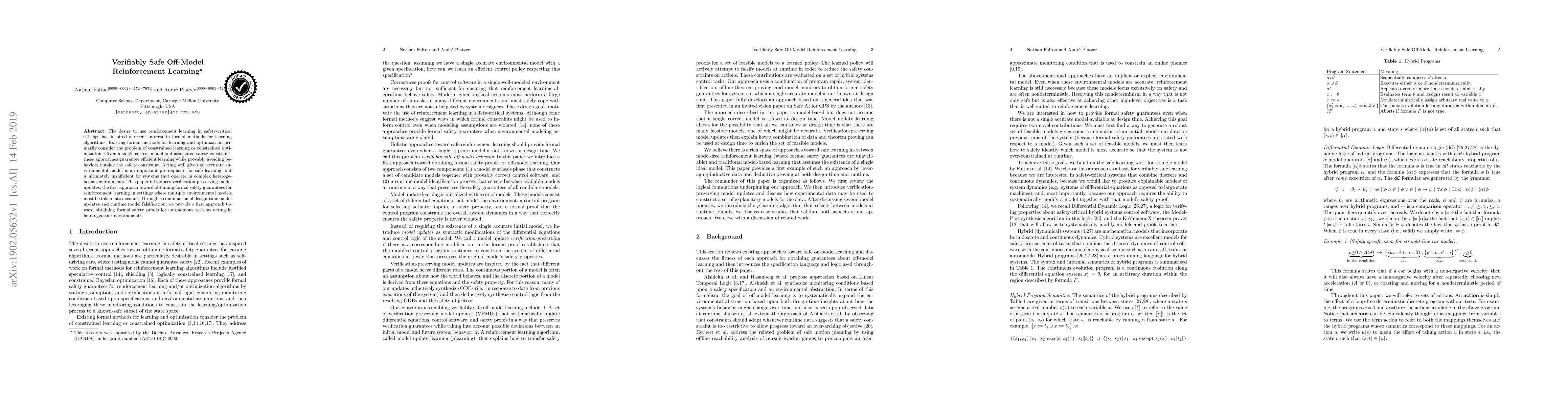 The desire to use reinforcement learning in safety-critical settings has inspired a recent interest in formal methods for learning algorithms. Existing formal methods for learning and optimization primarily consider the problem of constrained learning or constrained optimization. Given a single correct model and associated safety constraint, these approaches guarantee efficient learning while provably avoiding behaviors outside the safety constraint. Acting well given an accurate environmental model is an important pre-requisite for safe learning, but is ultimately insufficient for systems that operate in complex heterogeneous environments. This paper introduces verification-preserving model updates, the first approach toward obtaining formal safety guarantees for reinforcement learning in settings where multiple environmental models must be taken into account. Through a combination of design-time model updates and runtime model falsification, we provide a first approach toward obtaining formal safety proofs for autonomous systems acting in heterogeneous environments.