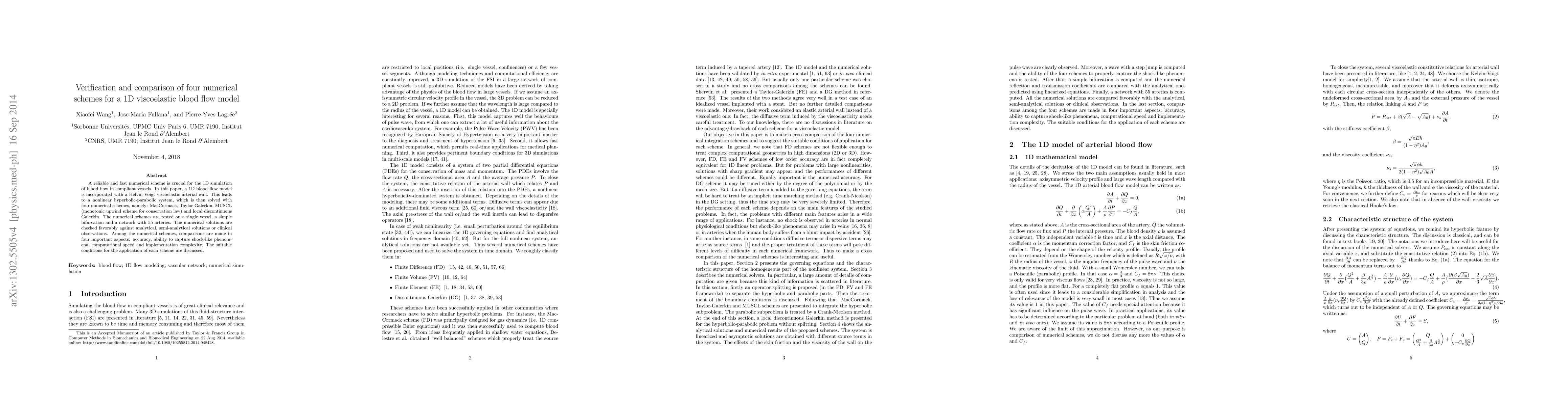 This paper evaluates four numerical schemes—MacCormack, Taylor-Galerkin, MUSCL, and local discontinuous Galerkin—for solving a 1D viscoelastic blood flow model incorporating a Kelvin-Voigt arterial wall. The schemes are compared based on accuracy, shock-capturing ability, computational speed, and implementation complexity across various vessel configurations.