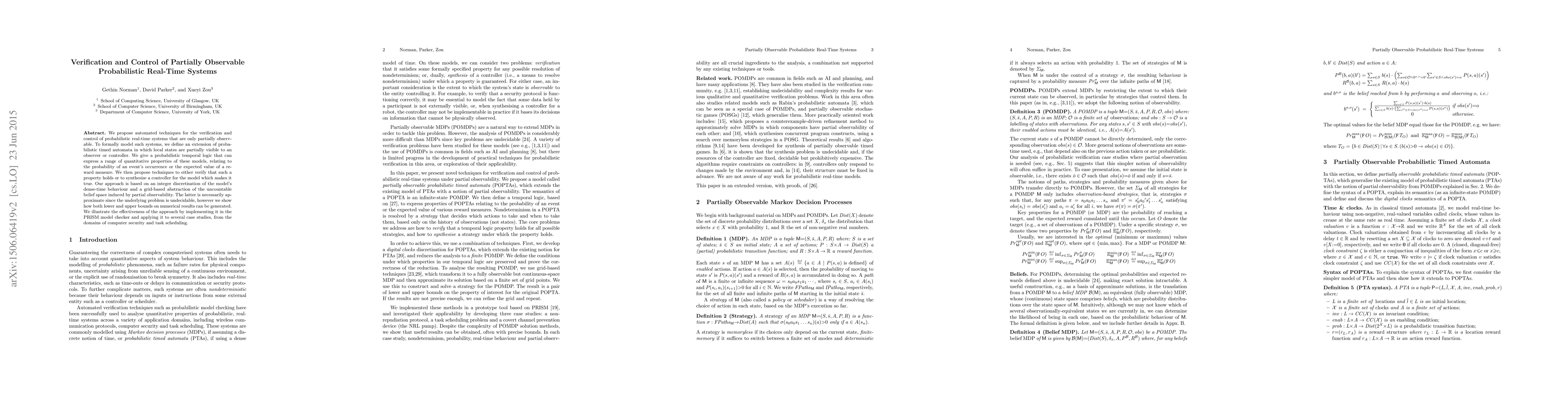 This paper proposes automated techniques for verifying and controlling partially observable probabilistic real-time systems, extending probabilistic timed automata and employing a probabilistic temporal logic to express quantitative properties. It uses discretisation and grid-based abstraction to manage the inherent undecidability of the problem, demonstrating effectiveness through implementation in PRISM and application to computer security and task scheduling.