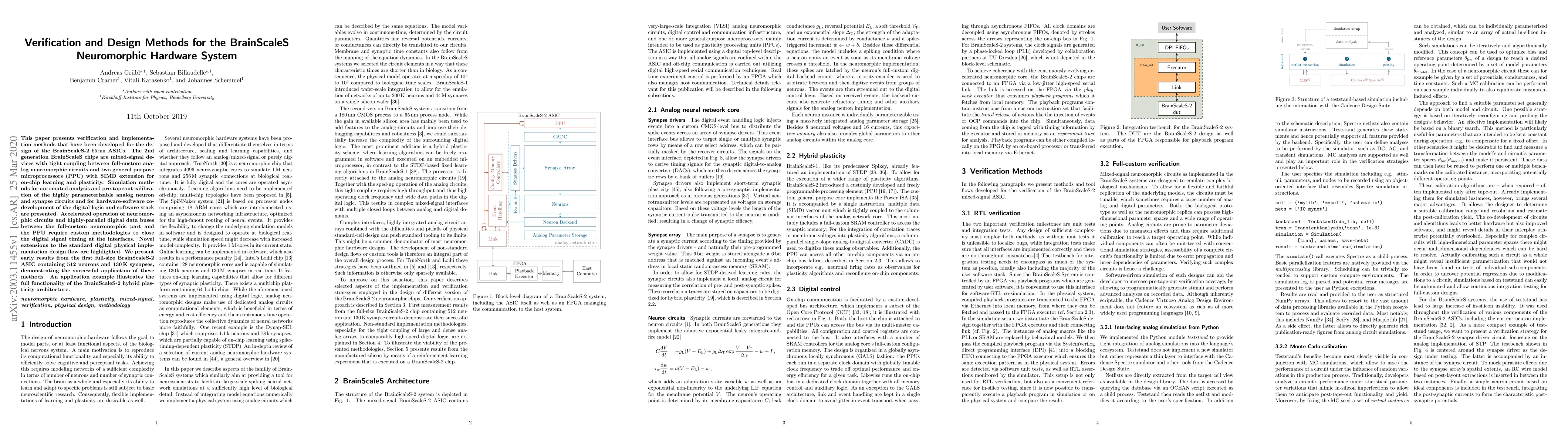 This paper details verification and design methods for the BrainScaleS-2 neuromorphic hardware system, focusing on mixed-signal chips integrating custom analog circuits and microprocessors. It presents novel simulation and co-development techniques, alongside early results from the first full-size ASIC demonstrating successful application of these methods.