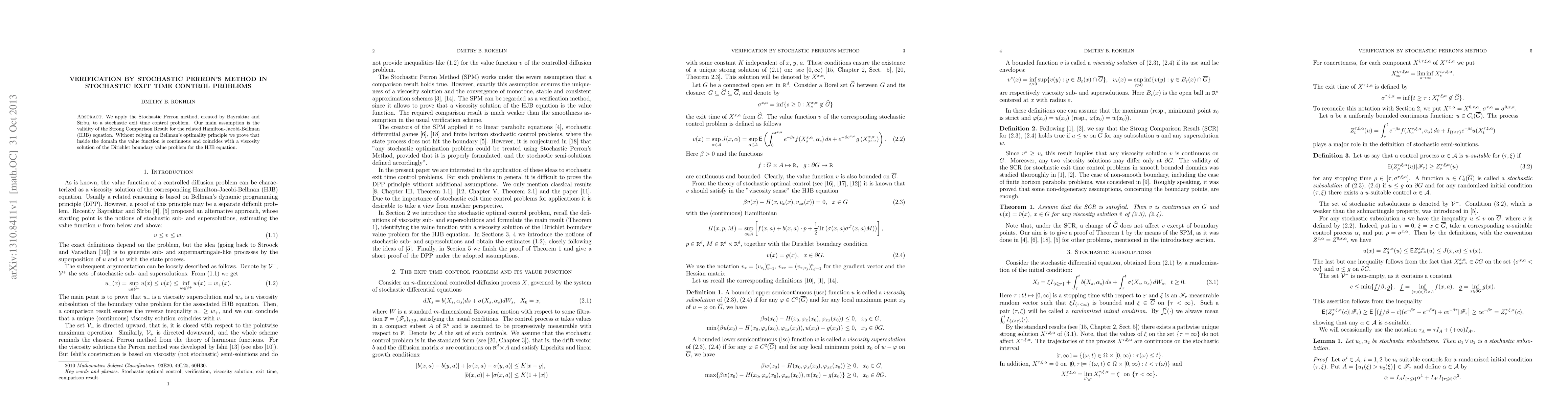 This paper applies the Stochastic Perron method to solve a stochastic exit time control problem, proving continuity and coincidence of the value function with a viscosity solution of the associated Hamilton-Jacobi-Bellman equation under the Strong Comparison Result, without using Bellman's principle of optimality.