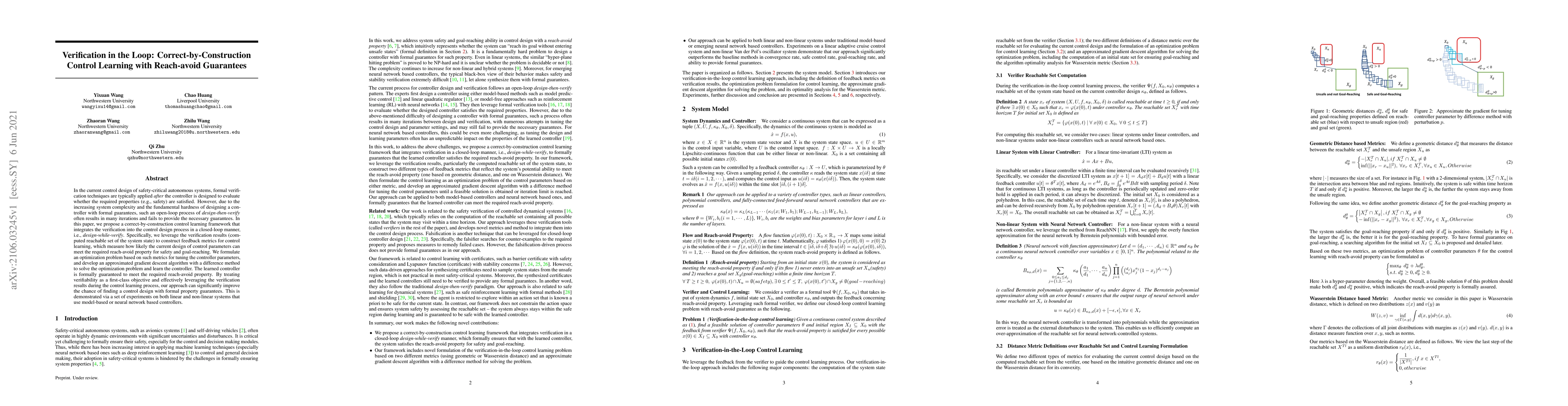 This paper proposes a novel control learning framework that integrates formal verification into the design process to ensure safety properties, termed "design-while-verify." It uses verification results to guide the learning of controllers, ensuring reach-avoid guarantees through an optimization approach, ultimately achieving correct-by-construction control with formal safety assurances.