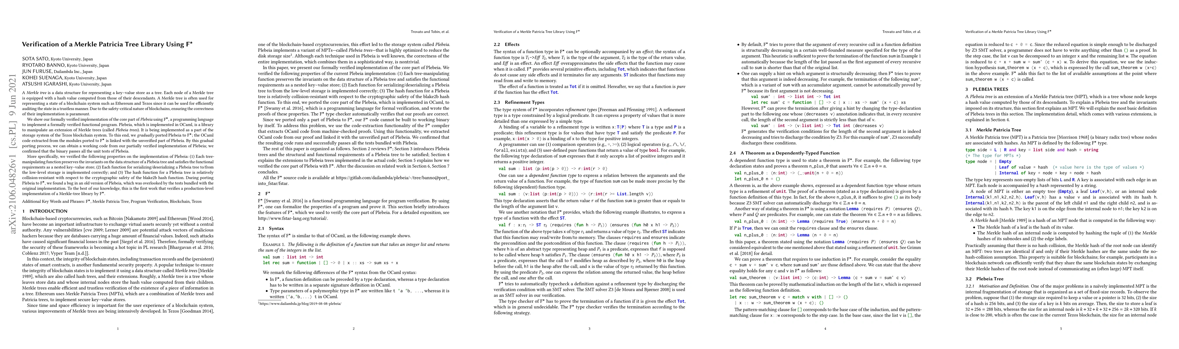 This research presents a formally verified implementation of Plebeia, a Merkle Patricia tree library for the Tezos blockchain, using the F* verification framework. The authors verified properties ensuring the correctness of tree manipulation, serialization/deserialization, and the cryptographic security of the hash function, discovering a previously undetected bug in the original code.