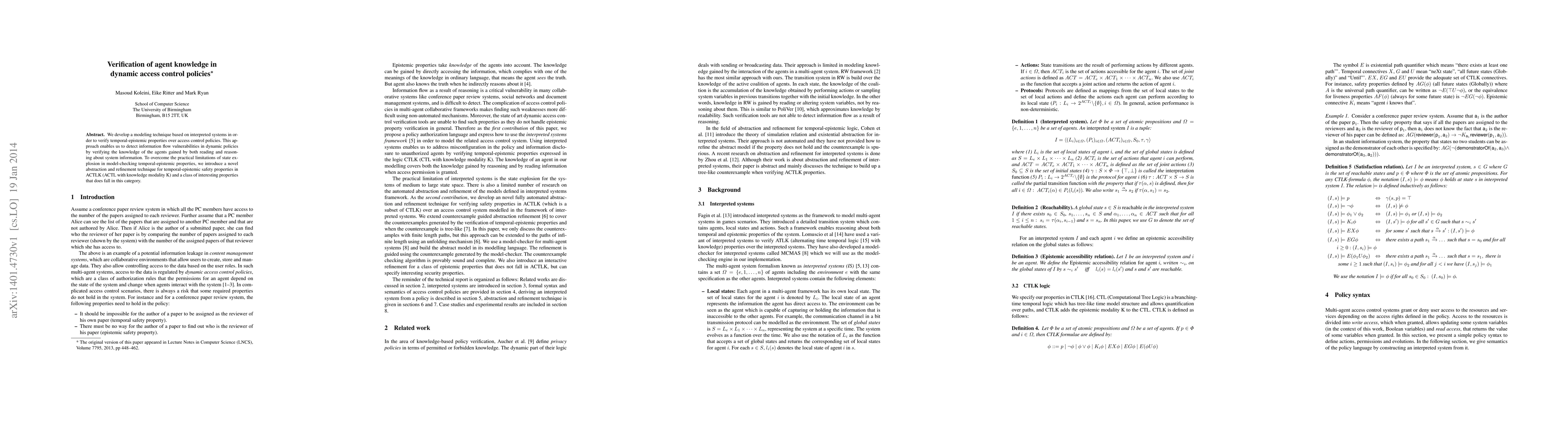 This paper proposes a modeling technique to verify temporal-epistemic properties of dynamic access control policies, detecting information flow vulnerabilities by checking agent knowledge. It introduces a novel abstraction and refinement technique to address state explosion issues in model-checking.