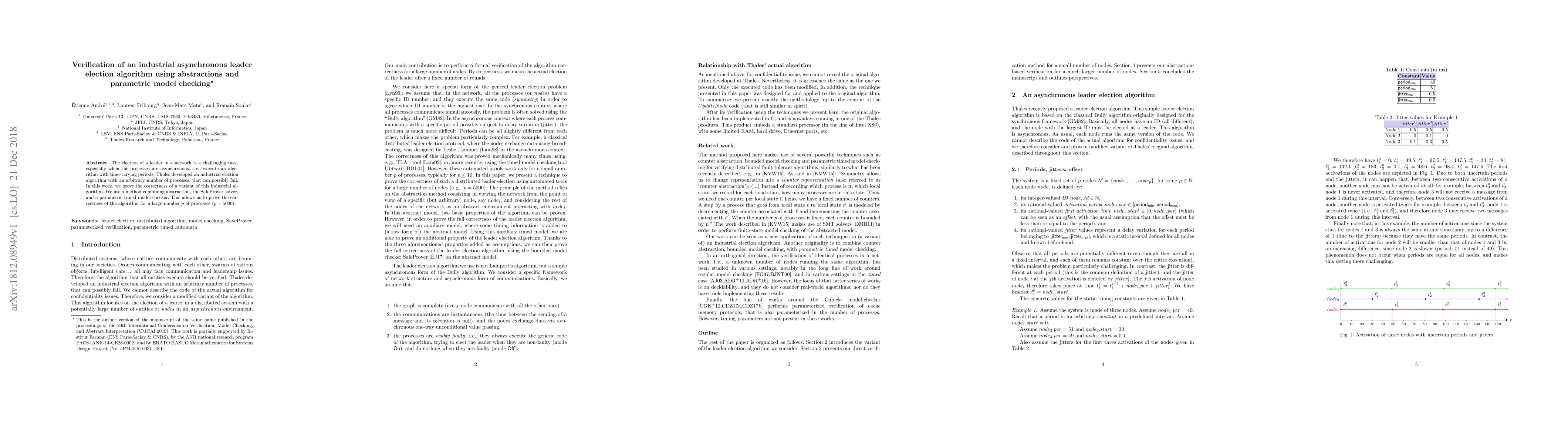 This paper verifies the correctness of an industrial asynchronous leader election algorithm developed by Thales using abstraction and parametric model checking. The authors employ the SafeProver solver and a parametric timed model-checker to prove the algorithm's correctness for up to 5000 processes.