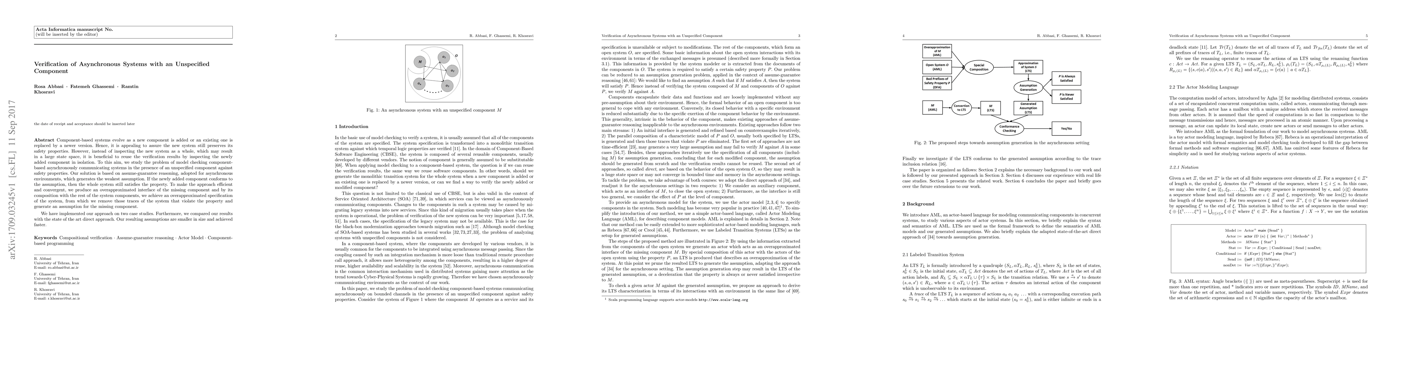 This paper proposes an assume-guarantee approach to verify asynchronous systems with an unspecified component, ensuring safety properties by isolating and checking the new component. The method generates an overapproximated interface for the missing component, leading to smaller and faster assumptions compared to the direct verification approach.