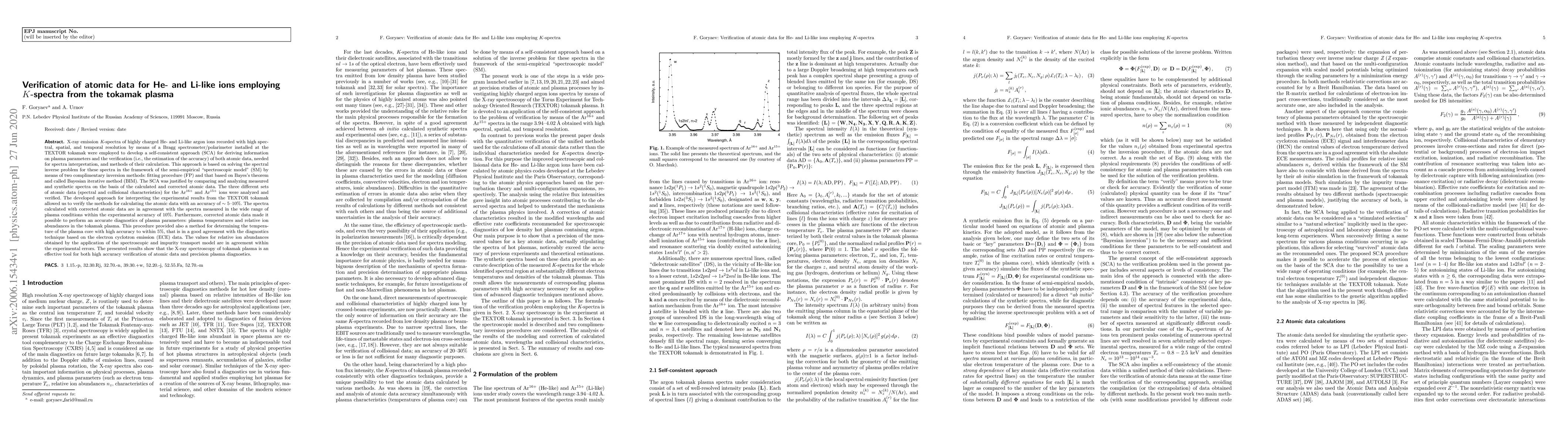 This paper verifies atomic data for He- and Li-like argon ions using high-resolution X-ray K-spectra from tokamak plasma, employing a self-consistent approach based on spectroscopic models and inversion methods. The verified atomic data enable accurate diagnostics of plasma parameters and confirm the effectiveness of X-ray spectroscopy for precision plasma diagnostics.