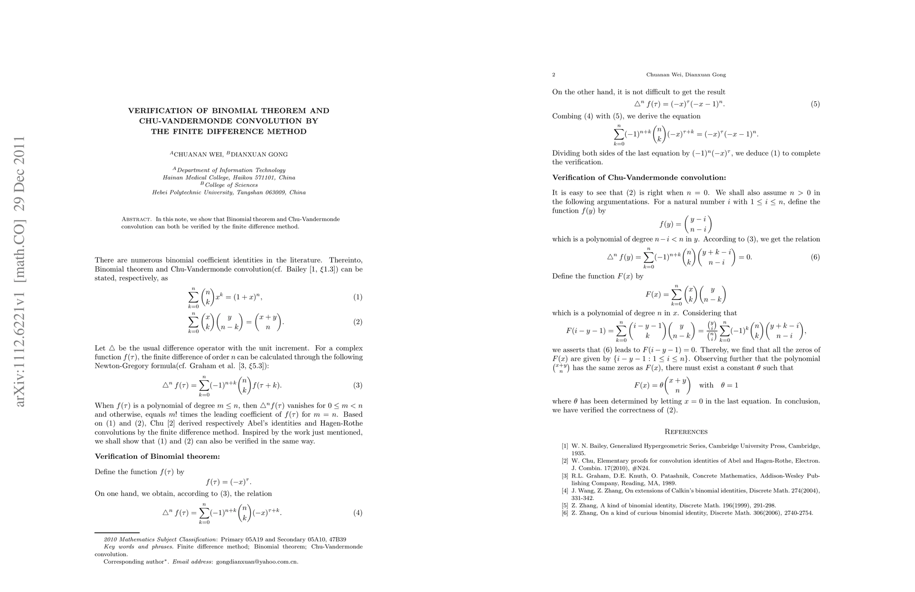Summary: This paper demonstrates the verification of the Binomial theorem and Chu-Vandermonde convolution using the finite difference method, providing a novel approach to confirming these mathematical identities.