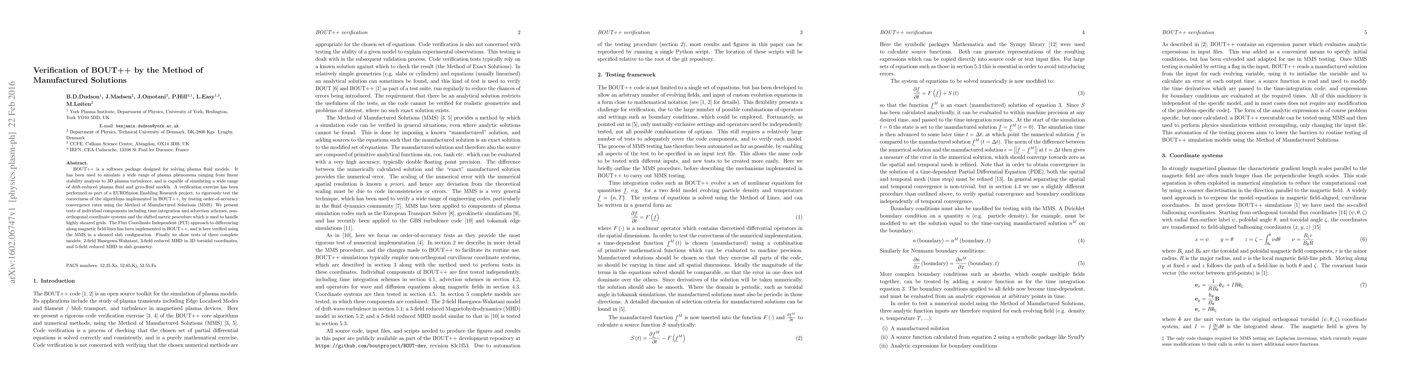 This paper verifies the BOUT++ software package for plasma fluid models using the Method of Manufactured Solutions, testing individual components and complete models to ensure algorithm accuracy and convergence rates. The study includes validation of time-integration, advection schemes, and the Flux Coordinate Independent differencing approach in various configurations.