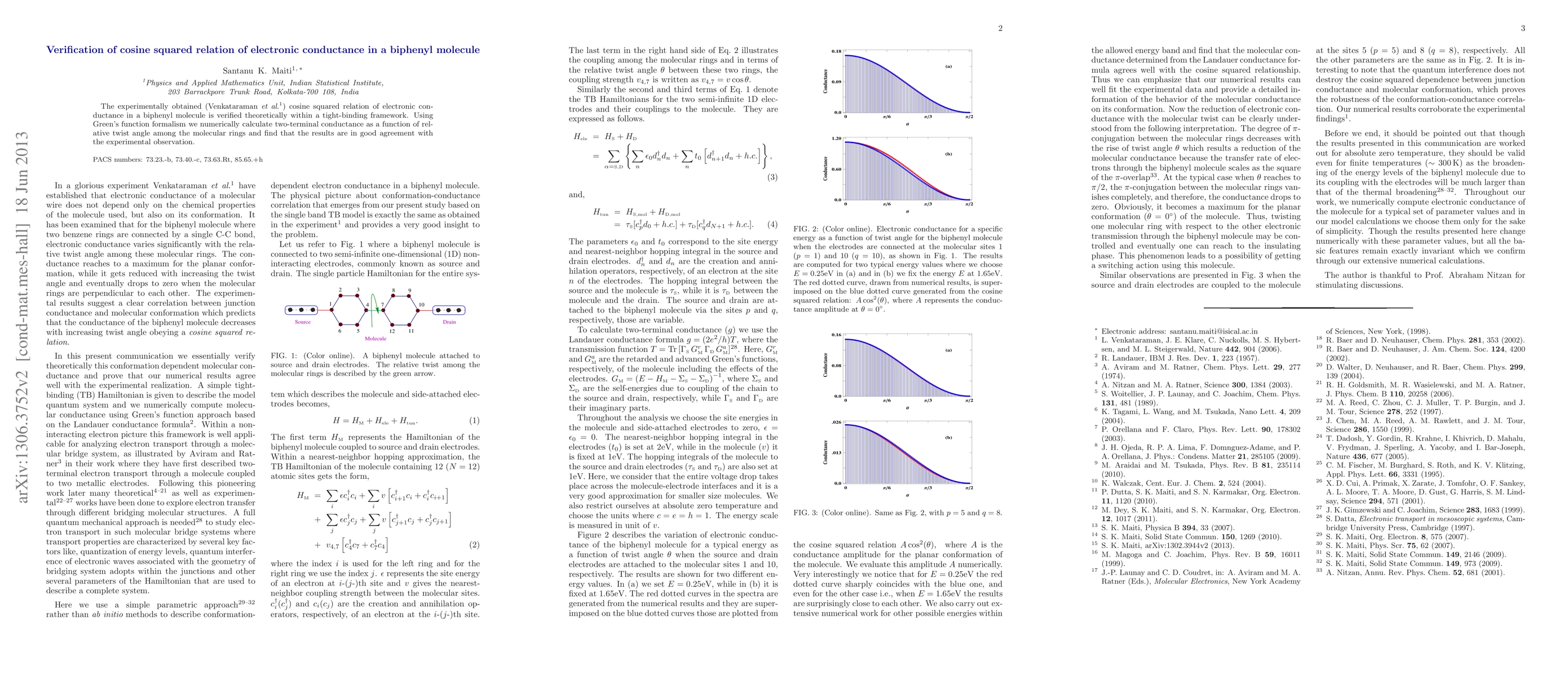 The paper verifies experimentally observed cosine squared relation of electronic conductance in a biphenyl molecule theoretically. Using Green's function formalism within a tight-binding framework, the study numerically calculates the two-terminal conductance as a function of relative twist angle, aligning with experimental results.