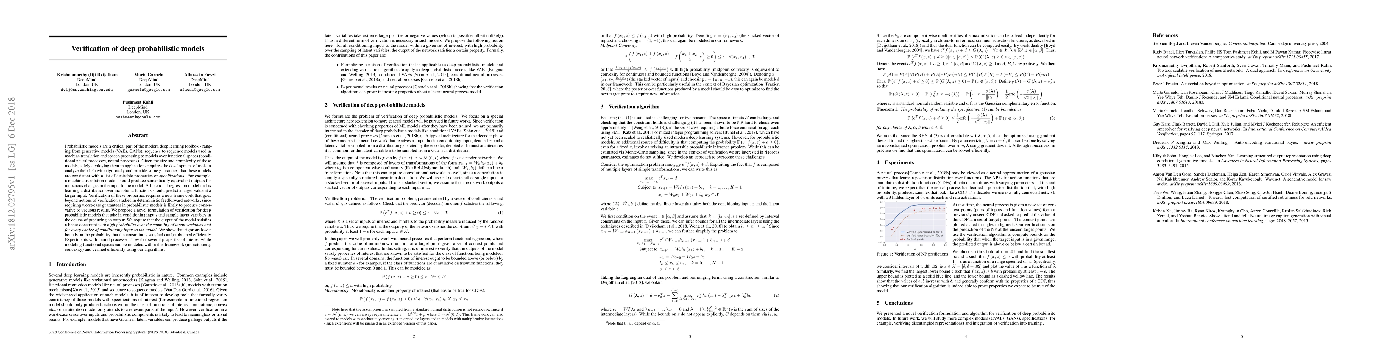 This paper proposes a novel framework for verifying deep probabilistic models, ensuring they meet desirable properties like monotonicity and convexity. The approach efficiently computes rigorous lower bounds on the probability that model outputs satisfy specified constraints, demonstrating its effectiveness through experiments with neural processes.
