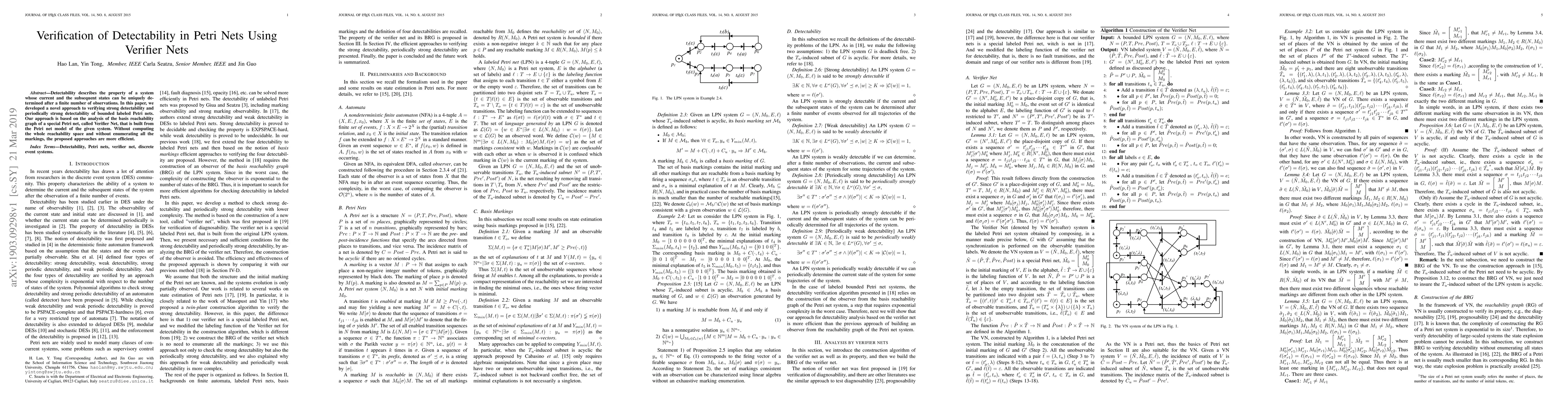 Detectability describes the property of a system whose current and the subsequent states can be uniquely determined after a finite number of observations. In this paper, we developed a novel approach to verifying strong detectability and periodically strong detectability of bounded labeled Petri nets. Our approach is based on the analysis of the basis reachability graph of a special Petri net, called Verifier Net, that is built from the Petri net model of the given system. Without computing the whole reachability space and without enumerating all the markings, the proposed approaches are more efficient.