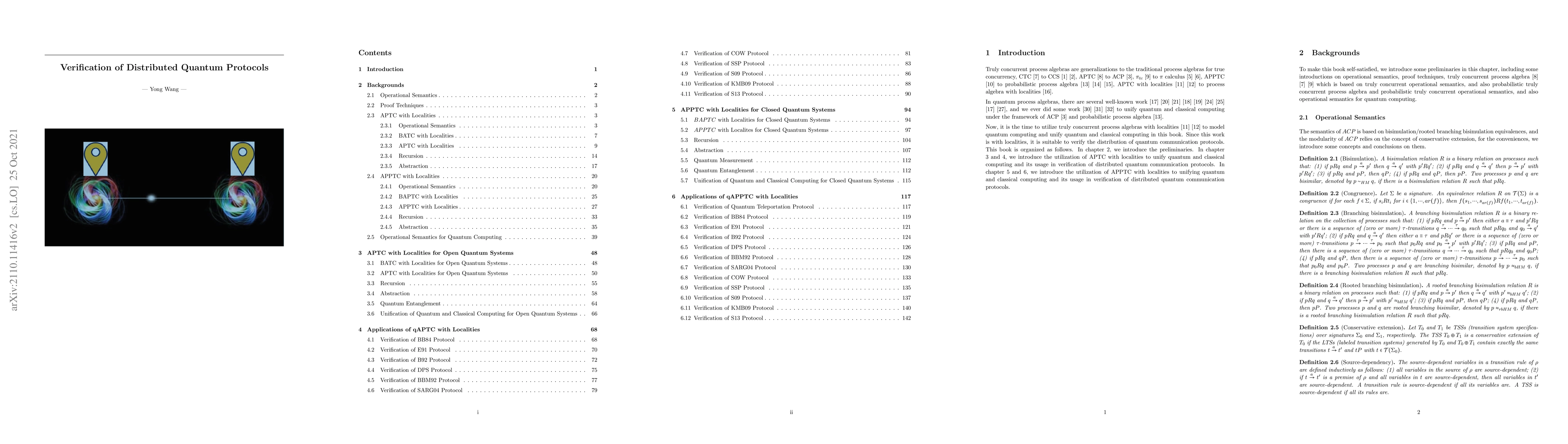 Truly concurrent process algebras are generalizations to the traditional process algebras for true concurrency, CTC to CCS, APTC to ACP, $\pi_{tc}$ to $\pi$ calculus, APPTC to probabilistic process algebra, APTC with localities to process algebra with localities. In quantum process algebras, there are several well-known work, and we ever did some work to unify quantum and classical computing under the framework of ACP \cite{ACP} and probabilistic process algebra. Now, it is the time to utilize truly concurrent process algebras with localities to model quantum computing and unify quantum and classical computing in this book. Since this work is with localities, it is suitable to verify the distribution of quantum communication protocols.