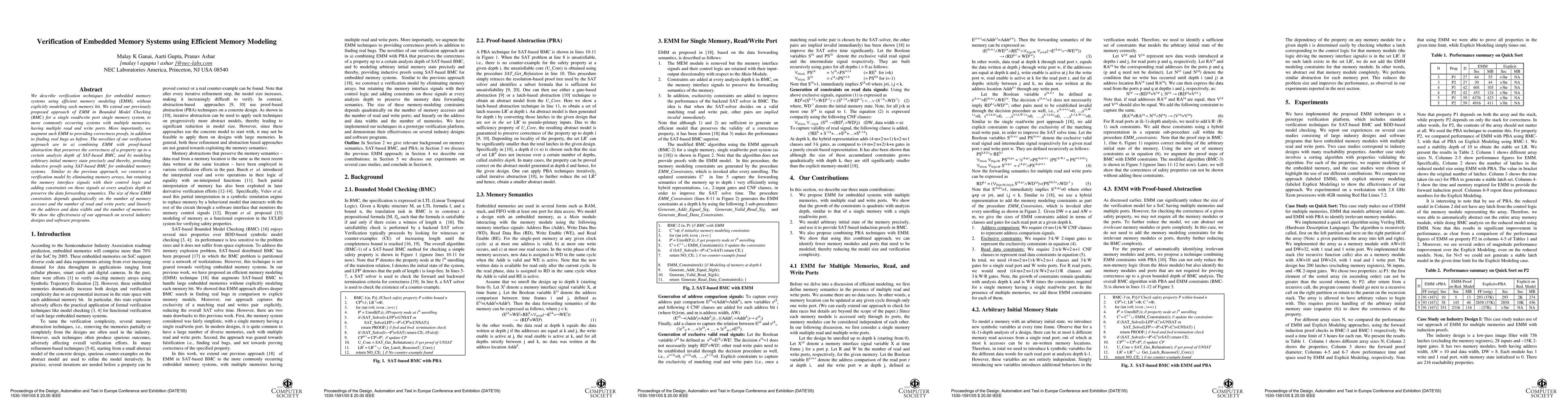 This paper presents verification techniques for embedded memory systems using efficient memory modeling (EMM) that avoids explicit modeling of each memory bit. It extends previous EMM techniques in Bounded Model Checking for systems with multiple memories and ports, and introduces proof-based abstraction to provide correctness proofs and inductive proofs.