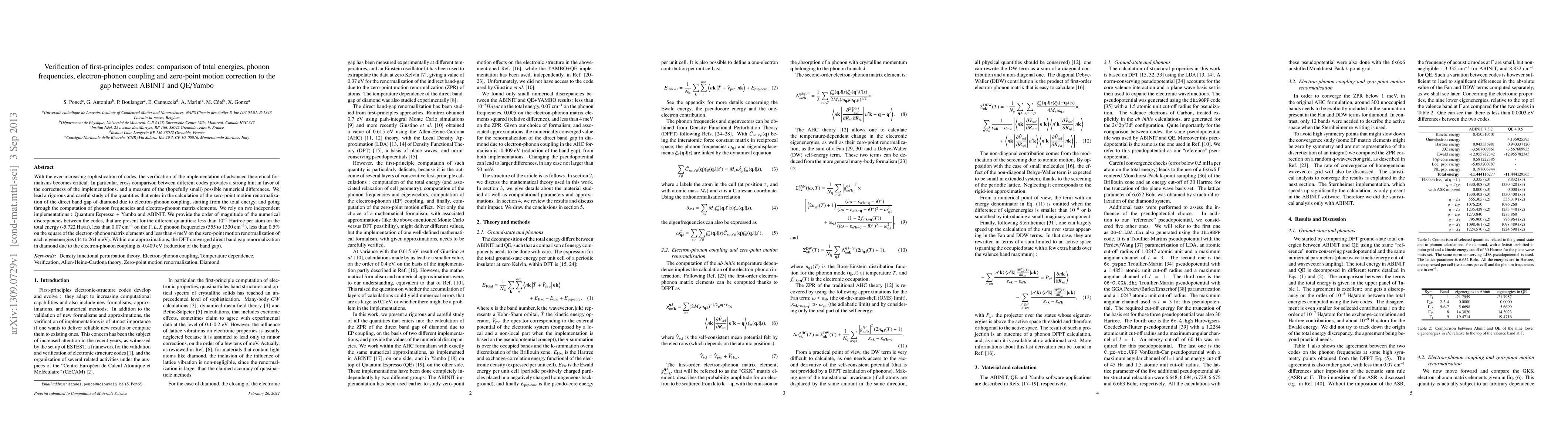This paper compares the results from two first-principles codes, ABINIT and Quantum Espresso + Yambo, focusing on total energies, phonon frequencies, electron-phonon coupling, and zero-point motion correction. The study finds minimal numerical discrepancies, with differences less than $10^{-5}$ Hartree per atom for total energy and less than 0.4% for electron-phonon coupling, leading to a converged band gap renormalization of -0.409 eV in diamond.