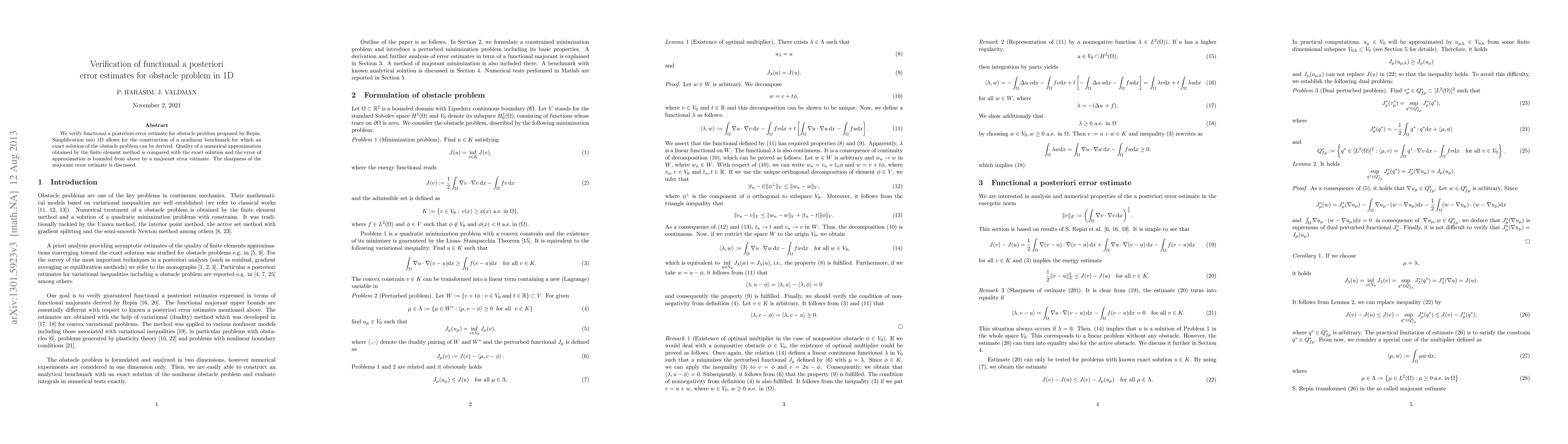 This paper verifies Repin's functional a posteriori error estimate for a 1D obstacle problem, constructing a nonlinear benchmark with an exact solution. The finite element method's numerical approximation is compared against this exact solution, demonstrating the estimate's effectiveness and sharpness.