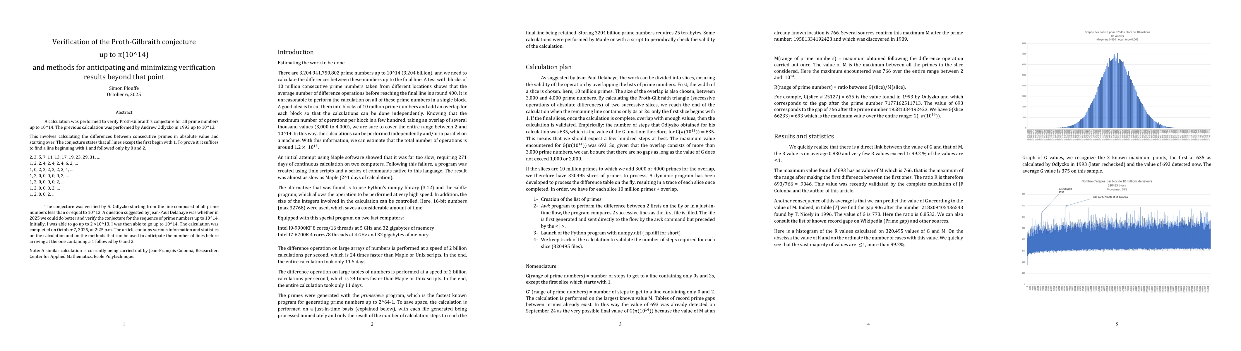 A calculation was performed to verify Proth-Gilbraith's conjecture for all prime numbers up to 10^14. The previous calculation was performed by Andrew Odlyzko in 1993 up to 10^13. This involves calculating the differences between consecutive primes in absolute value and starting over. The conjecture states that all lines except the first begin with 1. To prove it, it suffices to find a line beginning with 1 and followed only by 0 and 2.