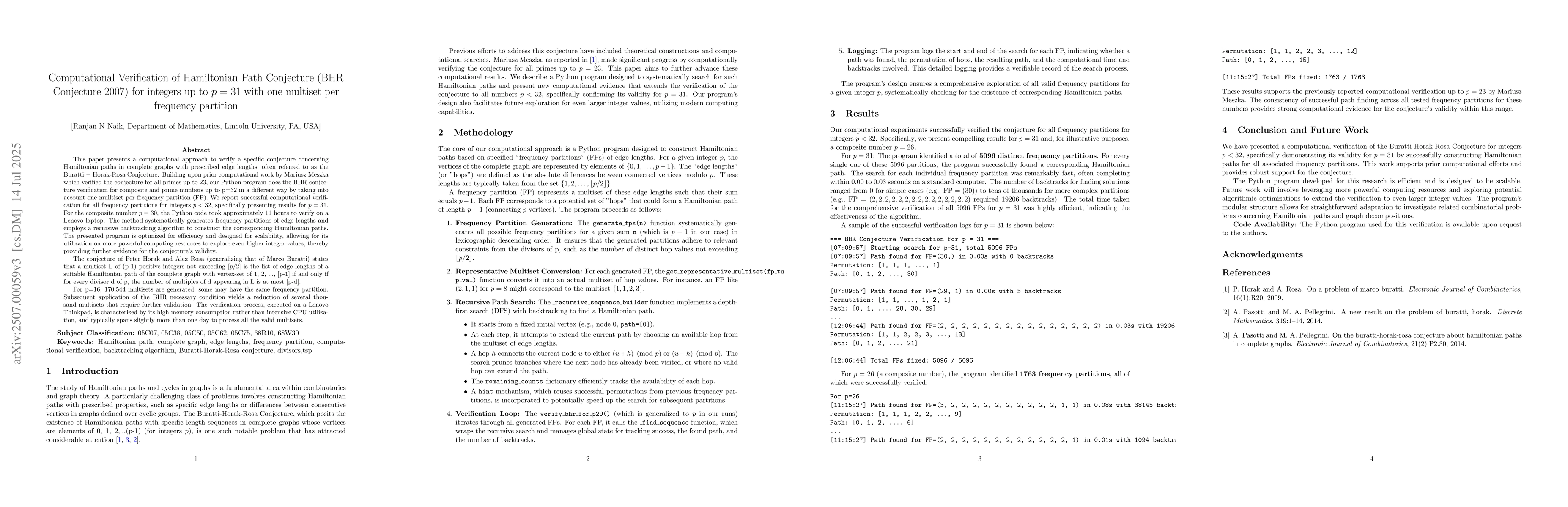 The BHR (Buratti-Horak-Rosa) Conjecture (2006) proposes that for every p and a multiset L of (p-1) positive integers modulo p, there exists a Hamiltonian path in the Complete Graph Kp with consecutive edge lengths given by the elements of L. In this article, we outline an approach to the conjecture based on frequency partitions and local/global adjustment operations and backtracking. We describe the mathematical strategy, experimental evidence, and implementation in a Python Program to explore valid Hamiltonian paths p < 37. This is a result an improvement over by Mariusz Meszka for all primes up to 23 (included) with the aid of a computer.