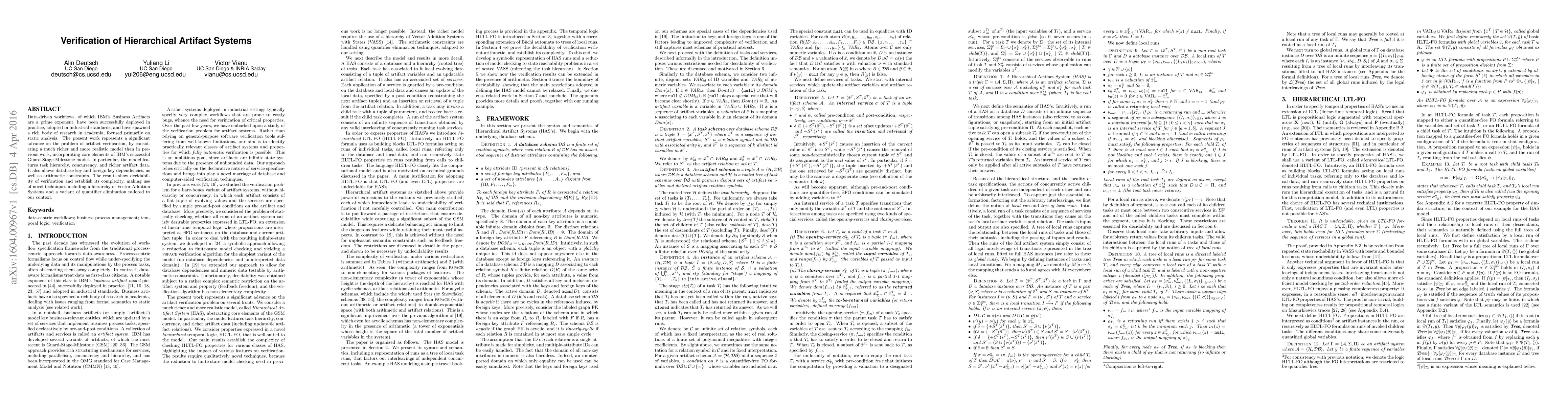 This paper advances artifact verification by introducing a more complex model incorporating task hierarchy, concurrency, and richer data, alongside database dependencies and arithmetic constraints. It establishes decidability and complexity using novel techniques like a hierarchy of Vector Addition Systems and a tailored quantifier elimination.