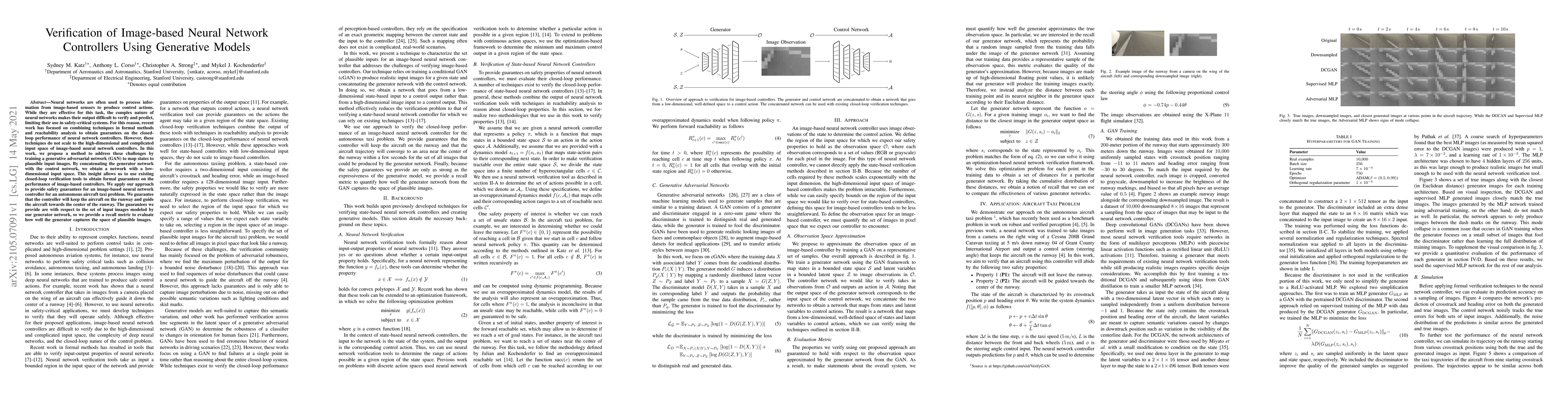 This paper proposes a method to verify image-based neural network controllers by training a GAN to map states to plausible input images, enabling the use of closed-loop verification tools for safety guarantees. The approach is demonstrated on an autonomous aircraft taxi problem, providing guarantees on the controller's performance within the modeled input space.