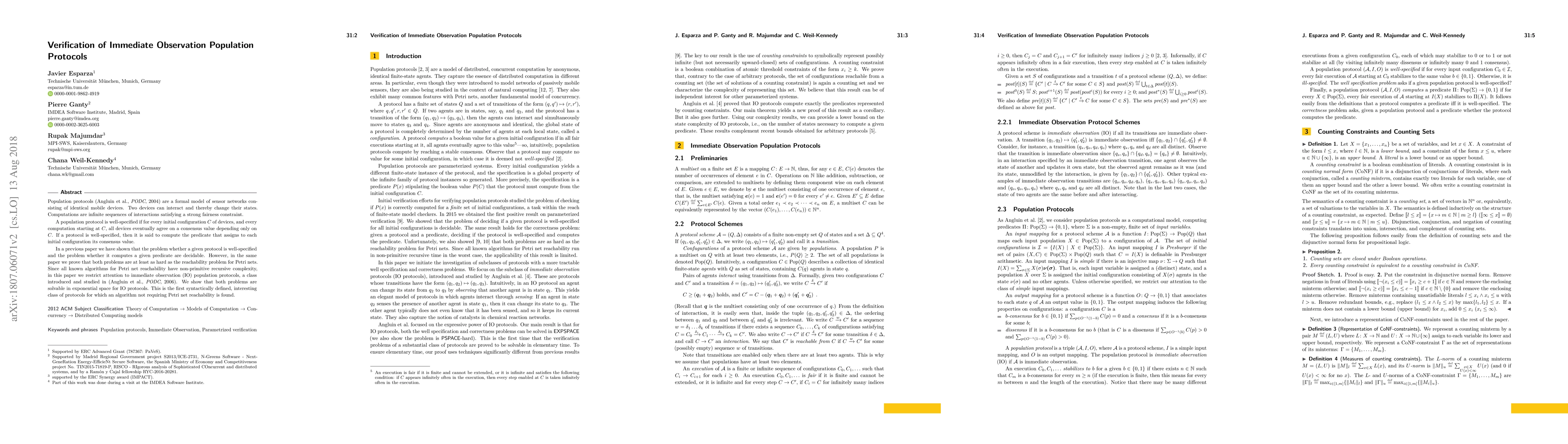 This paper verifies immediate observation population protocols, demonstrating that determining whether such protocols are well-specified and compute specific predicates can be solved in exponential space, providing the first algorithm for this class that does not rely on Petri net reachability.