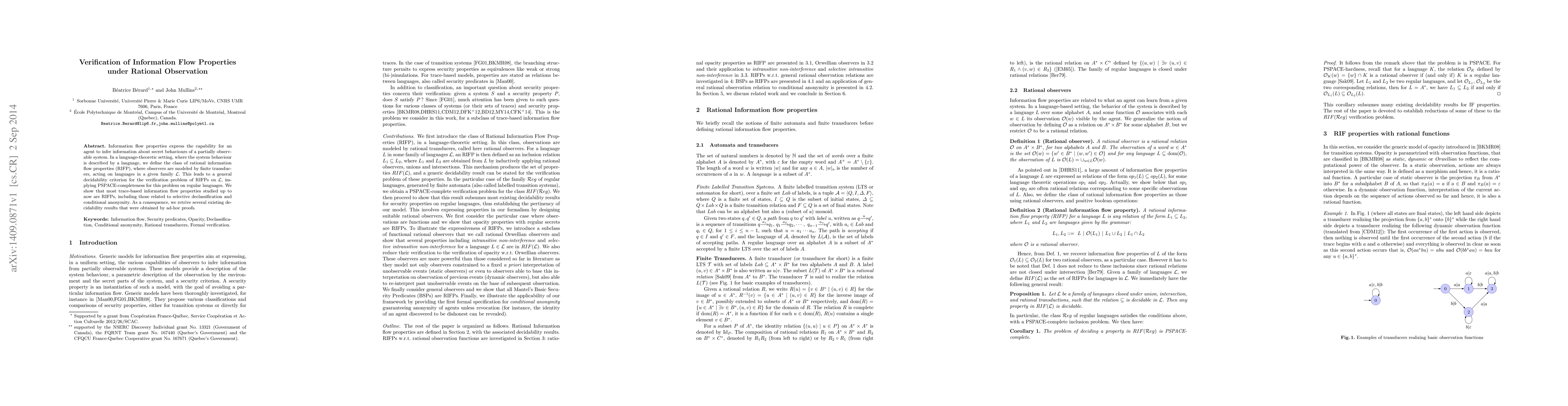 Information flow properties express the capability for an agent to infer information about secret behaviours of a partially observable system. In a language-theoretic setting, where the system behaviour is described by a language, we define the class of rational information flow properties (RIFP), where observers are modeled by finite transducers, acting on languages in a given family $\mathcal{L}$. This leads to a general decidability criterion for the verification problem of RIFPs on $\mathcal{L}$, implying PSPACE-completeness for this problem on regular languages. We show that most trace-based information flow properties studied up to now are RIFPs, including those related to selective declassification and conditional anonymity. As a consequence, we retrieve several existing decidability results that were obtained by ad-hoc proofs.